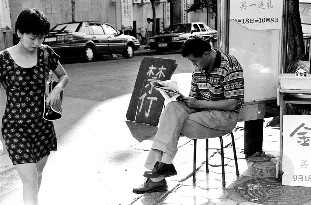▲《看报》(1999年10月4日,中山路) 摄影:徐崇德