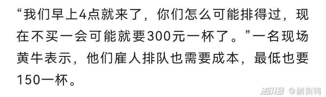 也就是说,这来的再早,黄牛也只能拿两杯进行倒卖……不过这也难不倒黄牛,人直接找来不少早起的大爷大妈有偿代排。