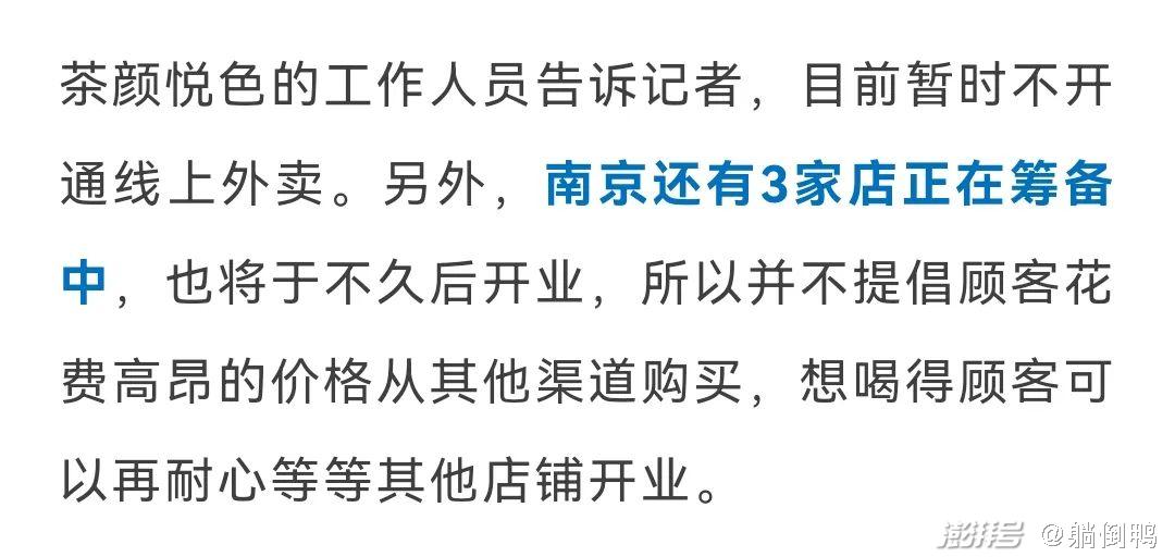 茶颜悦色工作人员也表示,不提倡找黄牛代购,以后在南京还会新开3家店,想喝到的顾客可以再耐心等等其它店铺开业。