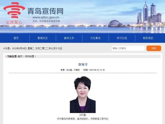 8月16日,青岛宣传网领导信息更新,刘升勤已任青岛市委常委、宣传部部长、市委教育工委书记。