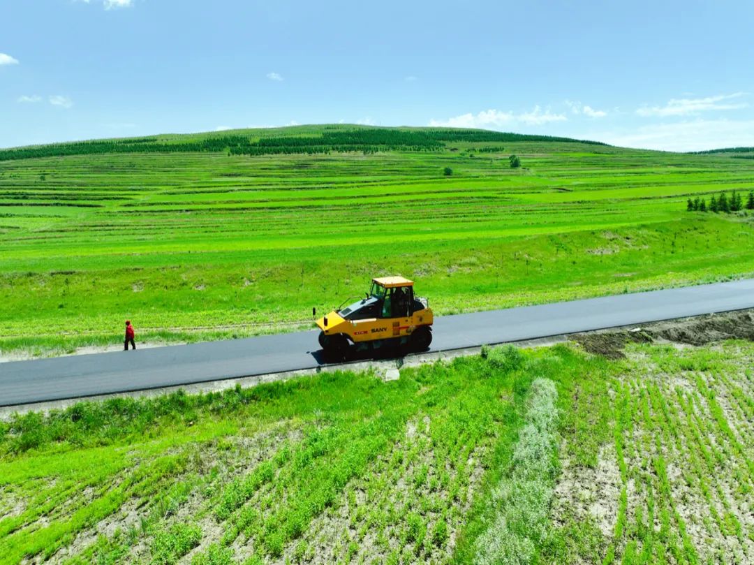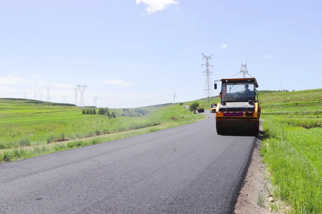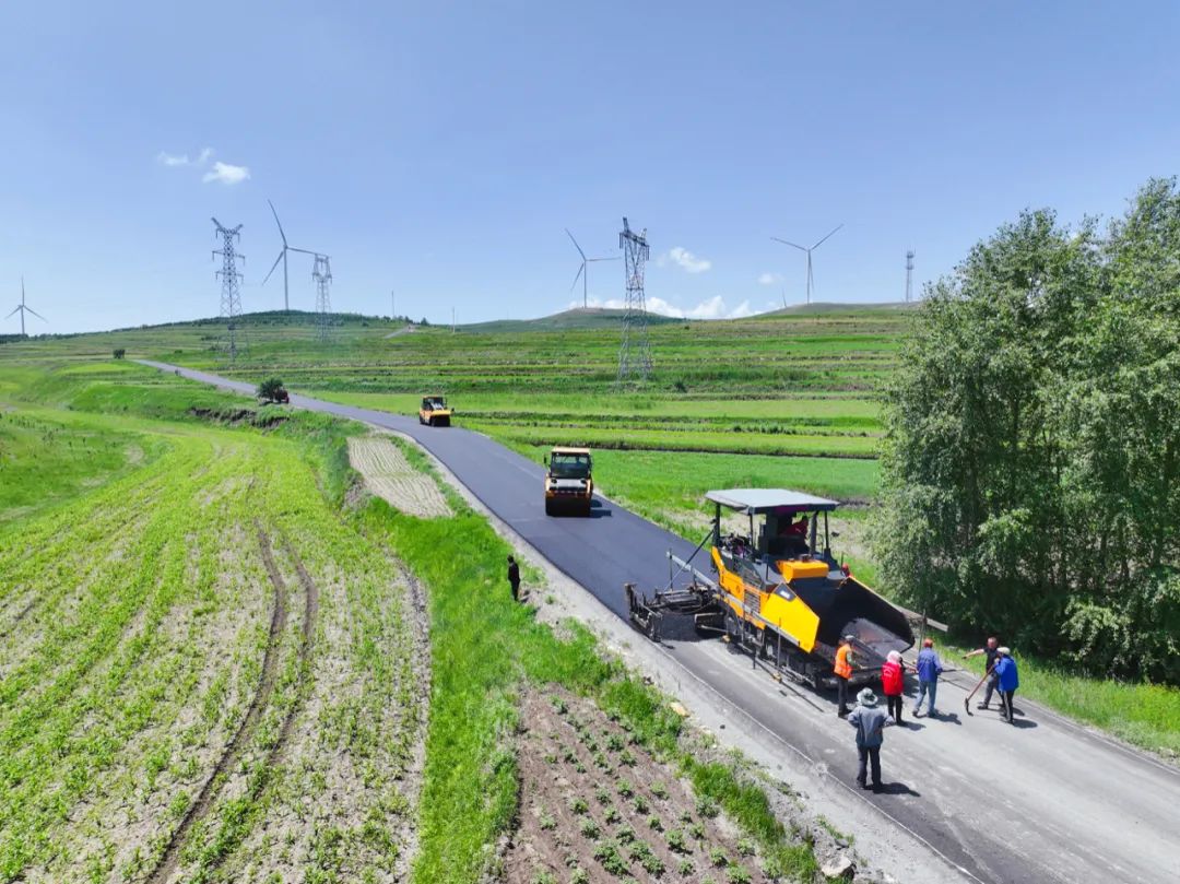 日前,在张家口市张北县草原天路提升工程建设现场,施工人员正进行路面摊铺、压实作业。