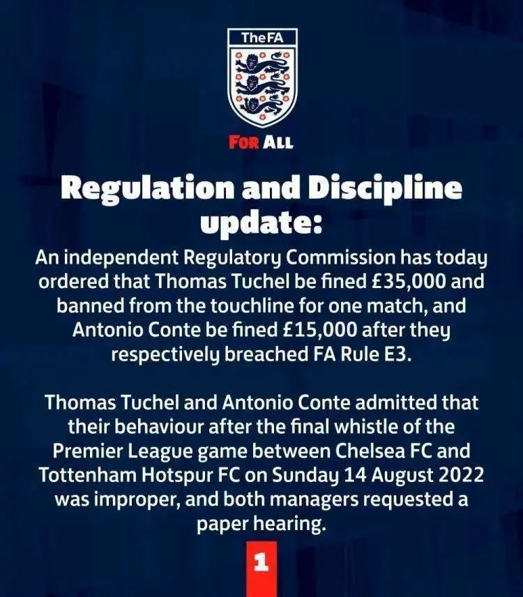切尔西和热刺之间的伦敦德比已于上周末结束,但这场比赛中的要素过多,并没有随着比赛一同翻篇。英足总在对图赫尔和孔蒂之间的冲突情况进行调查后,宣布对图赫尔处以停赛1场,罚款3.5万英镑的处罚。孔蒂没有被停赛,只是被罚款1.5万英镑。