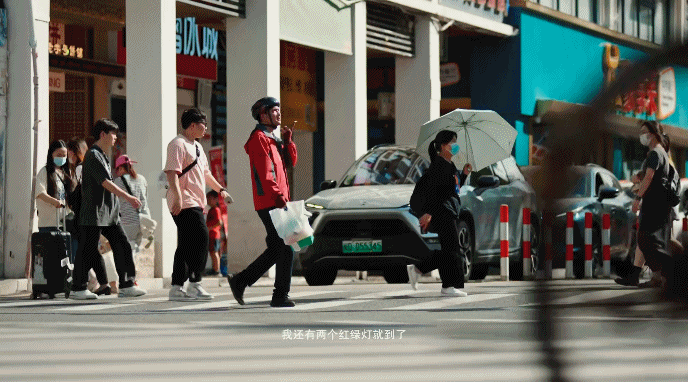 外卖员被顾客催促,在人流里争分夺秒,充满前行的冲劲。