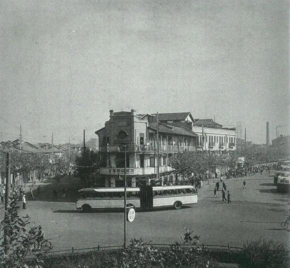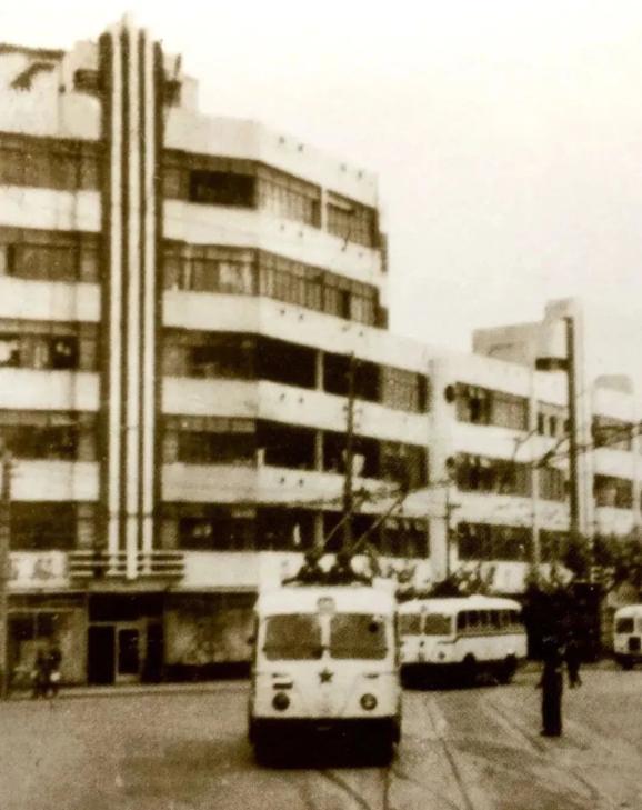 图说:替代有轨电车的26路无轨电车,经过淮海大楼。到这年国庆,淮海路出现长15.05米、宽2.45米、高2.98米的解放牌SKD663型铰接式26路,“巨龙”可载客141人。