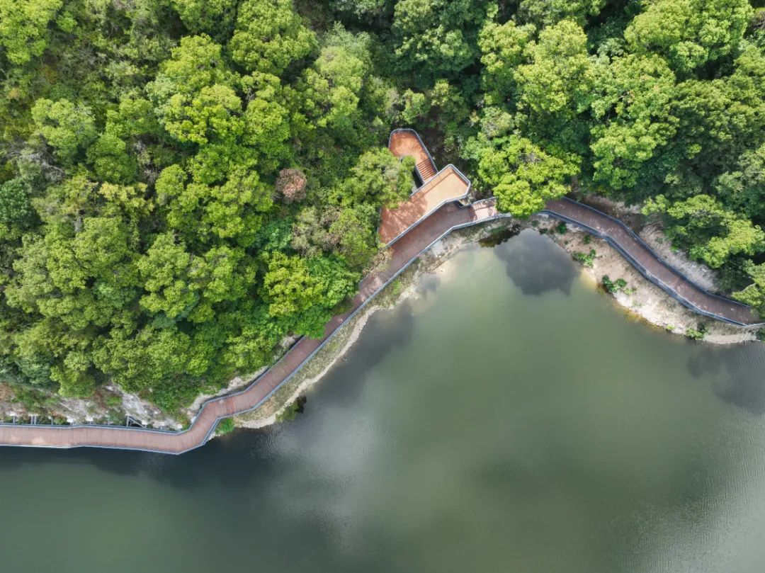 太和山绿道由长岙路入口段(长岙路至水仓里水库段),水仓里水库环道,山体架空连接段(水仓里水库至南门河)以及两座观景平台组成。项目线路总长约1226米,其中长岙路入口段约125米,环水仓里水库段约845米,山体架空连接段约256米。虽然绿道不长,但是从长岙路入口进,一路走走停停,既能看水波粼粼、树影摇曳,又能上观景平台享受凉风送爽,不需要跋山涉水,就能在城市中轻松享受大自然的美好。