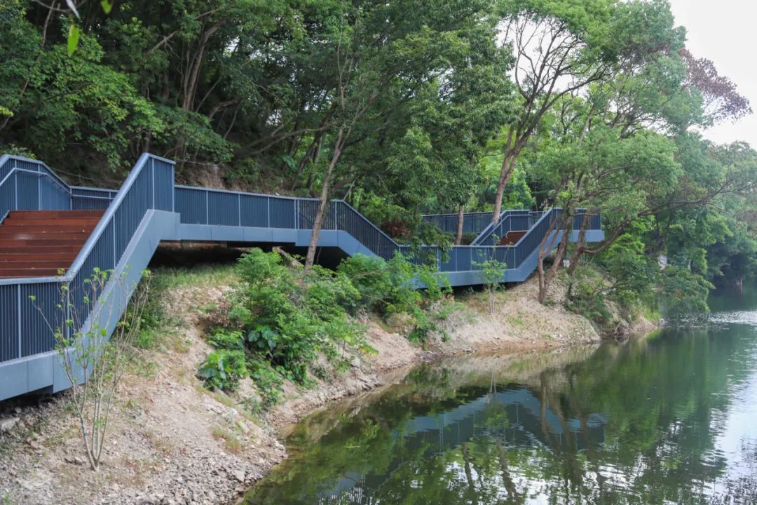 本工程由中国美术学院风景建筑设计研究总院有限公司设计,于2021年7月开工,预计2022年9月竣工验收,工程建安费约2500万元。绿道标准段路面宽度3米,环水仓里水库北侧落地段面层采用青石板及老石板。剩余水库环线悬崖段采用了整体性较强的钢结构体系,采用悬挑式,采用锚杆桩形式,下侧采用斜支撑的方式;其余架空段采用下部独立承台加钢柱,上部采用钢结构;面层采用原木色竹木板面层。