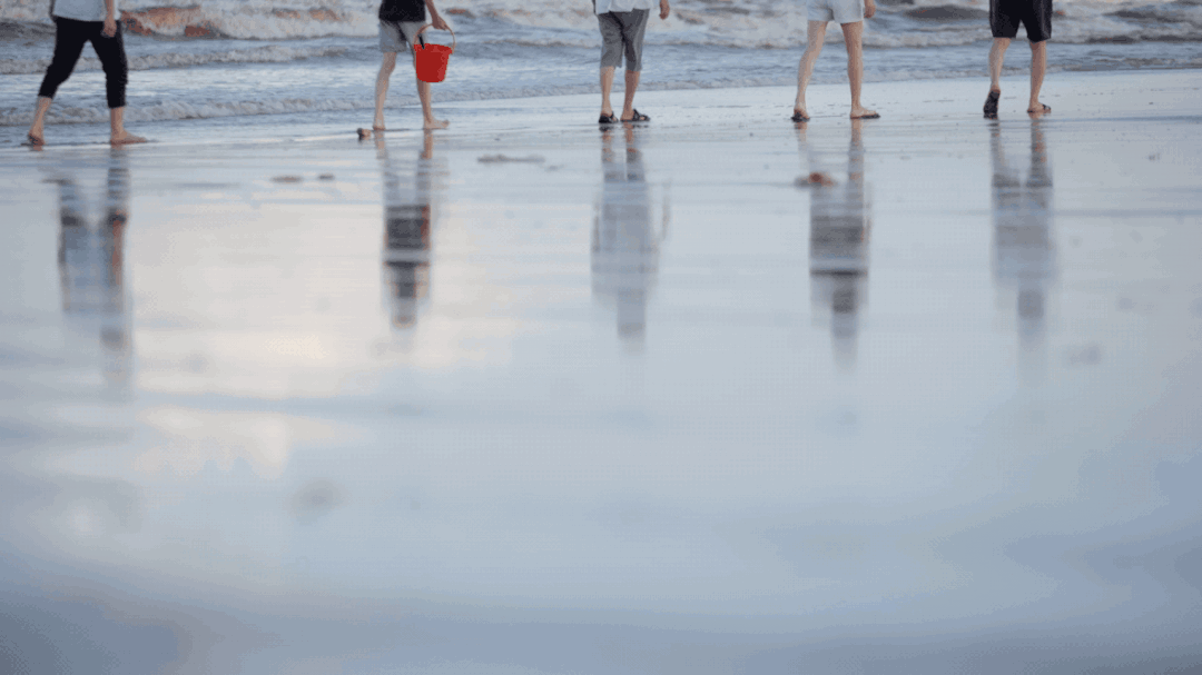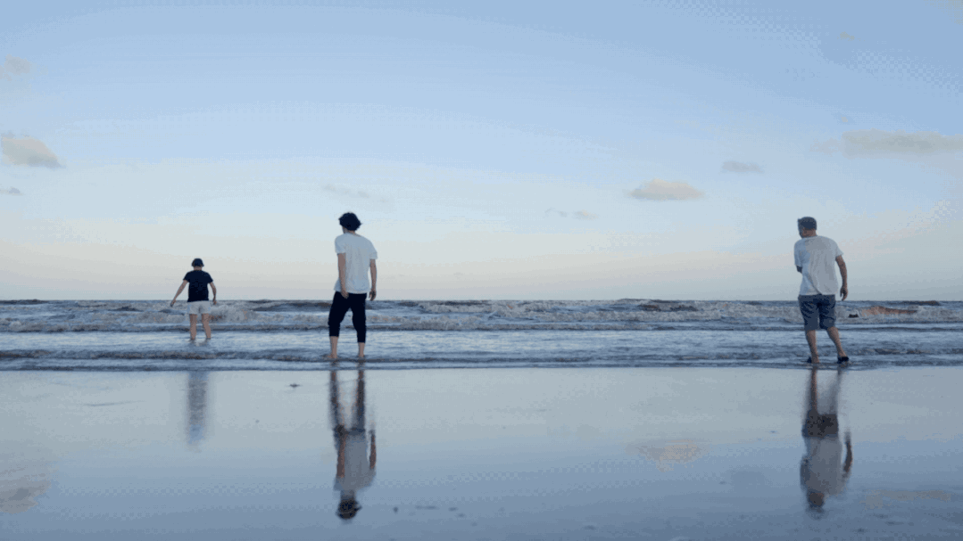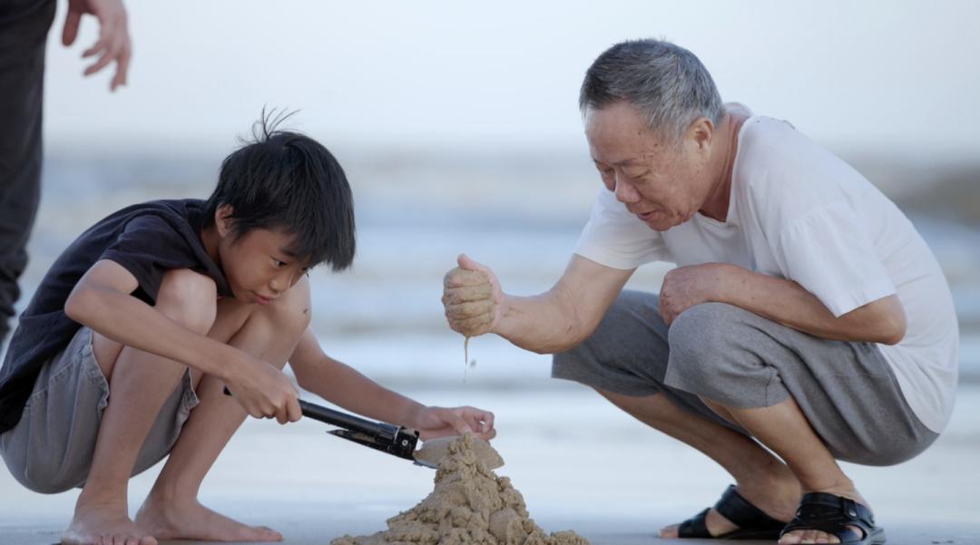 ▲夫妻俩带着儿子回来看爷爷,四人在海边玩耍