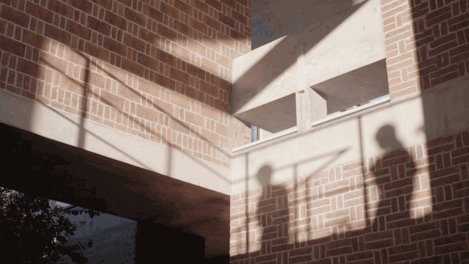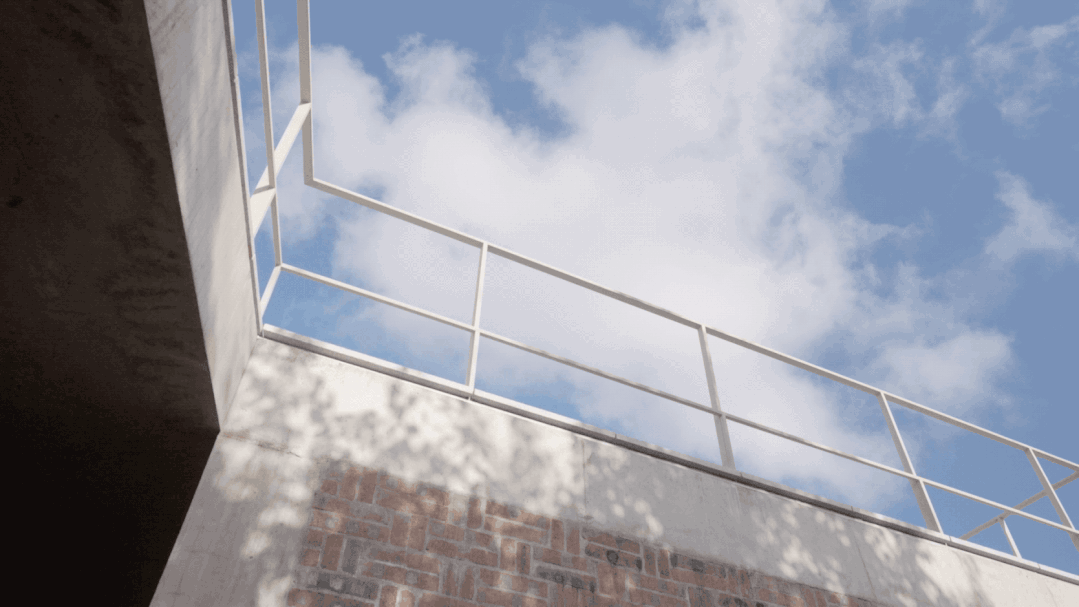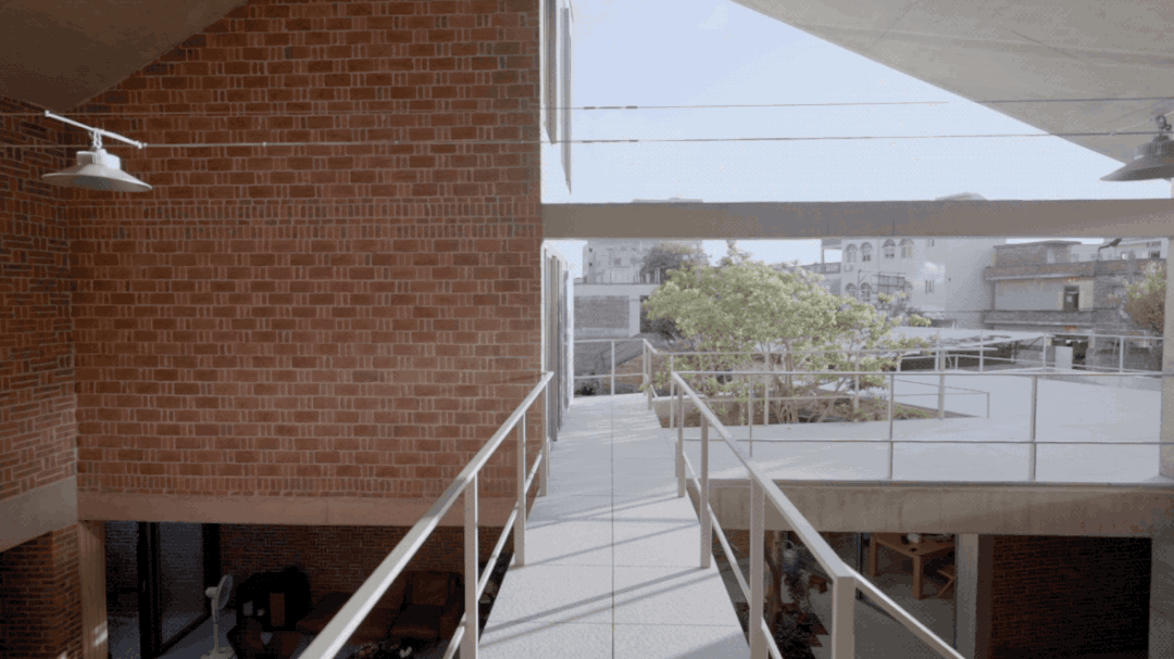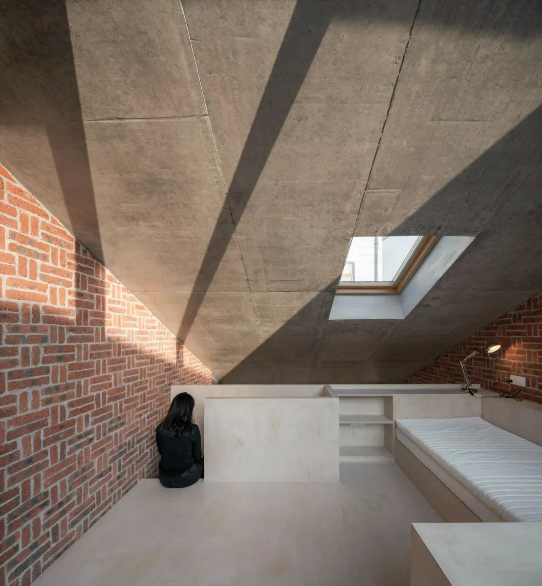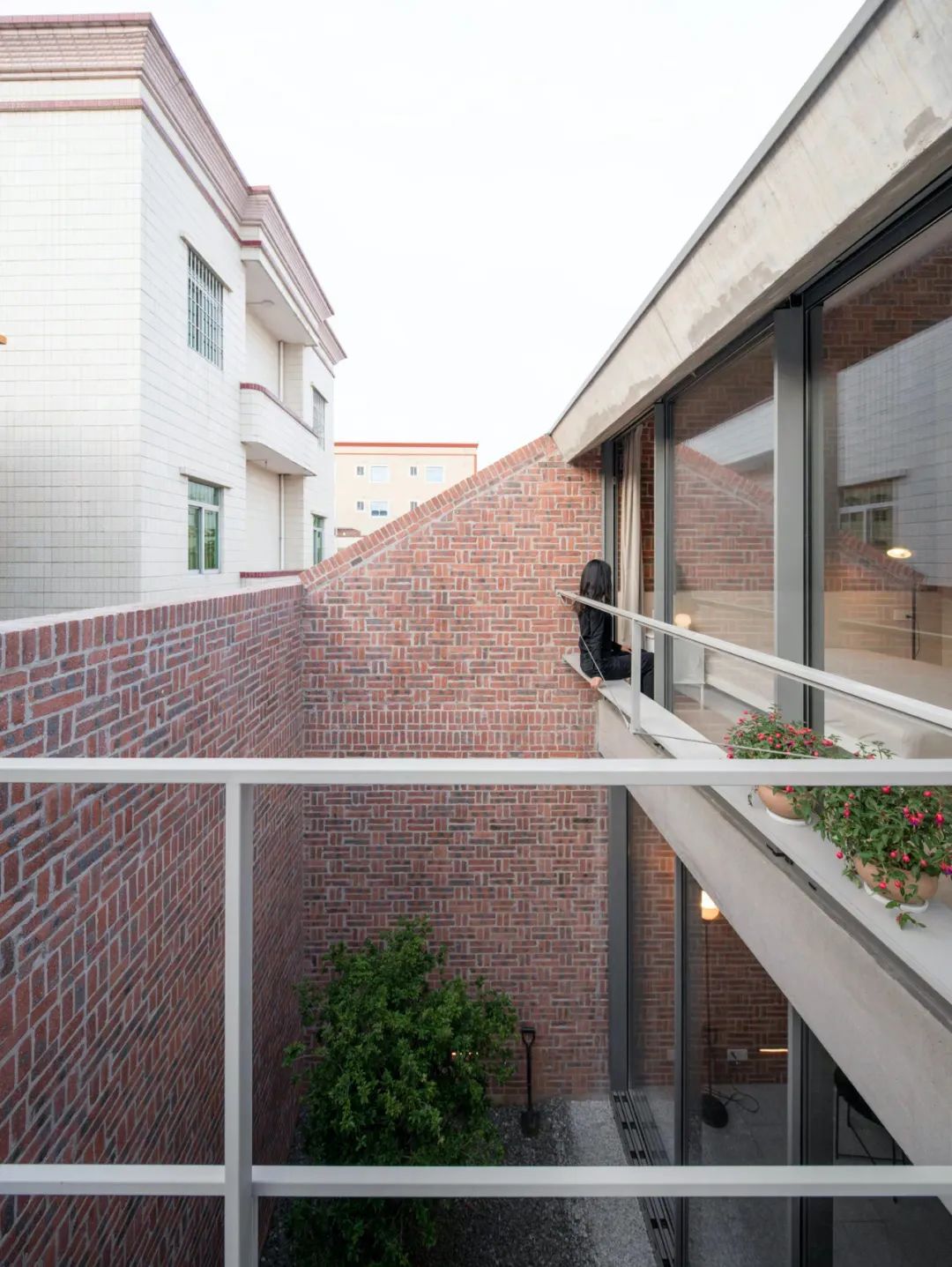 套间前后面各有一个出入口,和整个二层的户外空间连通起来,而不是一个封闭的房间。推开落地窗,栏杆可以转化为座凳,人坐在室内,脚荡在外面。直面邻居家外墙时,我们用砖砌栏板或高墙,与之保持一定的距离。而面对他们的空地时,则用一个阳台,一个虚的栏杆,有“打招呼”的意味。