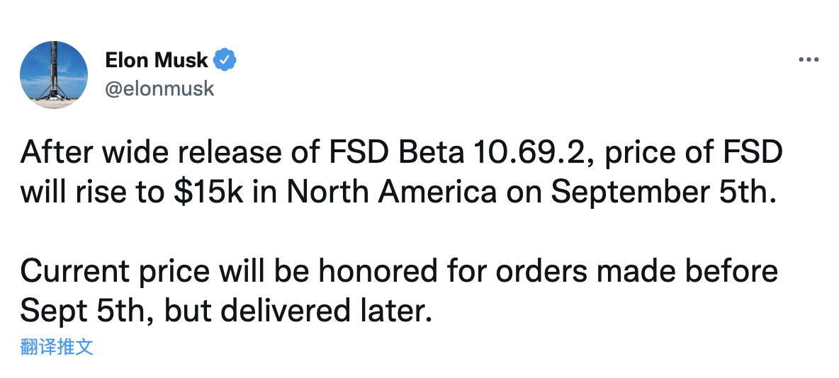 马斯克写道,在全自动驾驶系统测试版FSD Beta10.69.2版系统发布后,FSD在北美的价格将于9月5日涨至1.5万美元。对于9月5日之前下的订单,将按照当前1.2万美元的价格执行,但订单的交付将稍晚。
