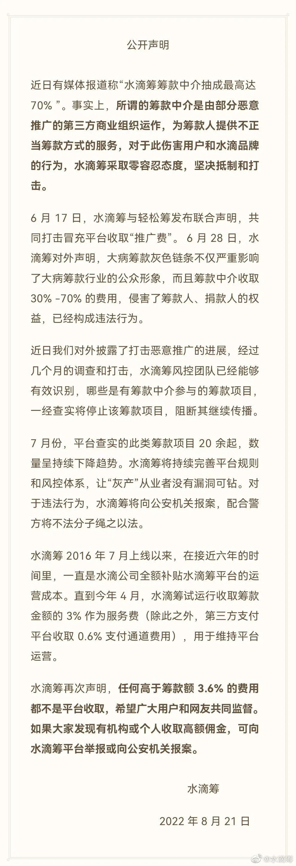 原标题:《抽成70%?水滴筹紧急回应》