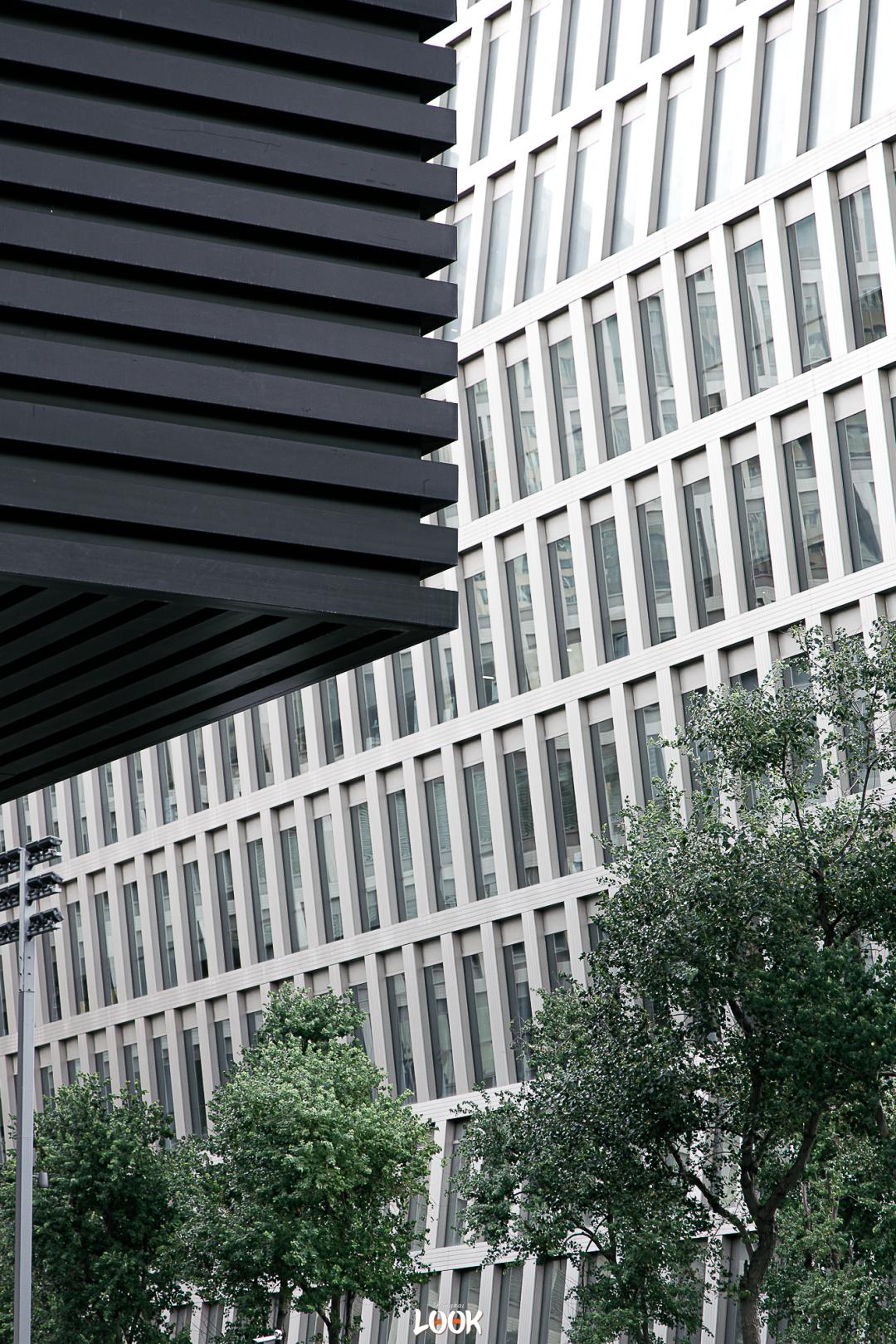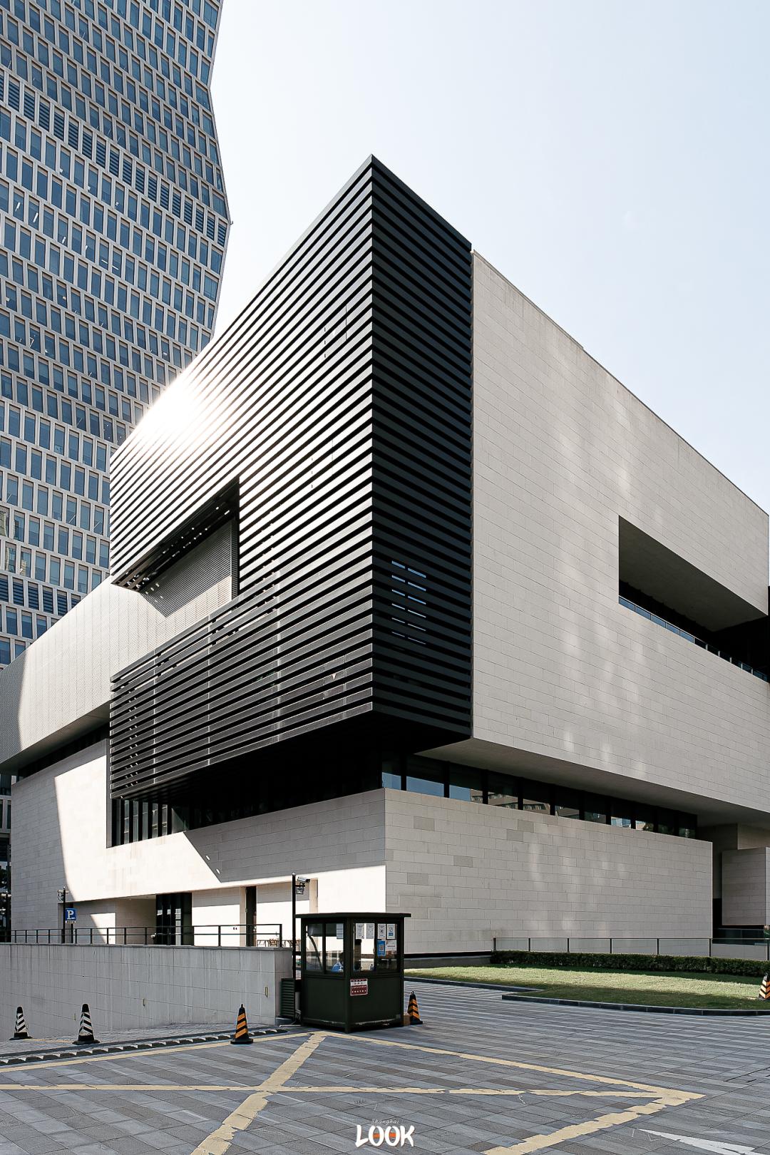 建筑悬空的空间采用了大片玻璃窗设计,像是一个大大的画框,城市景观中的一举一动都是画框中的作品。