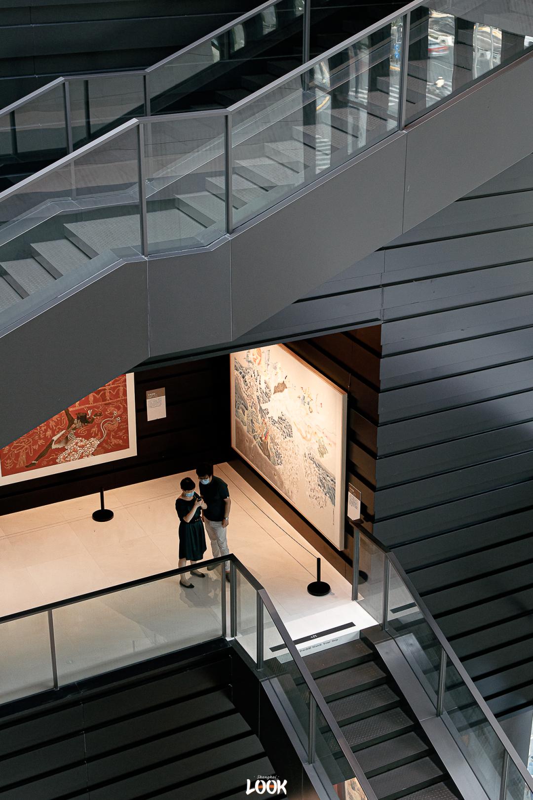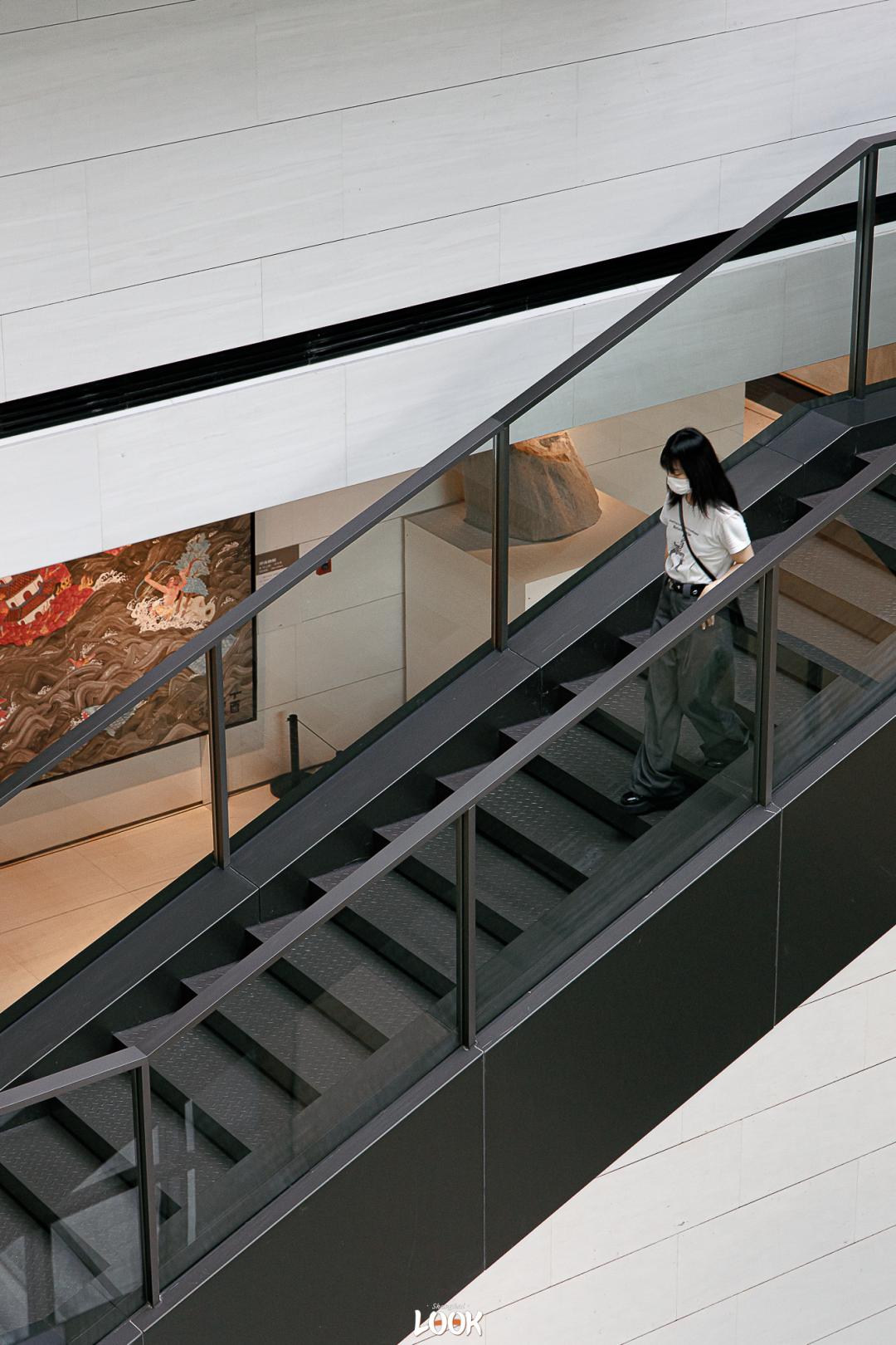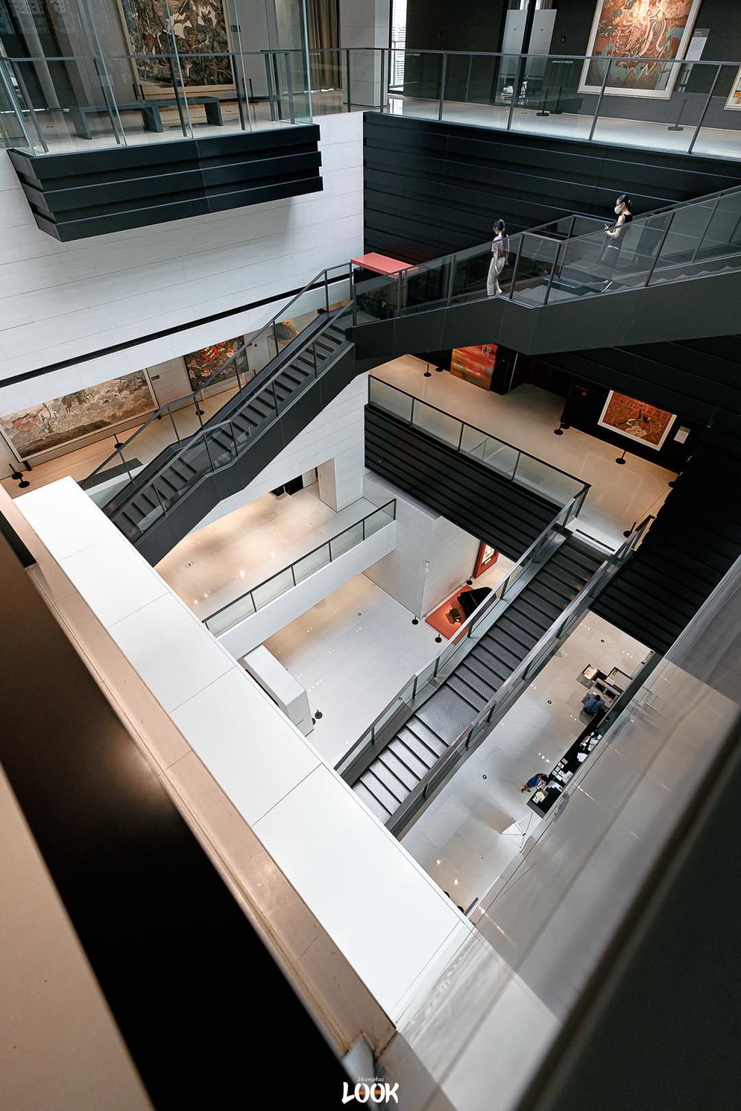 连接美术馆各个楼层的楼梯,在中庭缠绕盘旋而上,是室内空间重要的交通,也是充满趣味的空中游径,步行其中,能看到建筑中不同角度的景观。