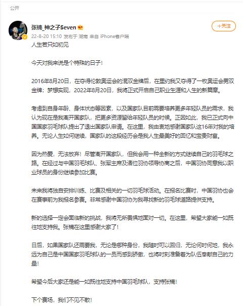 张楠社交媒体发文20日,羽毛球运动员张楠宣布退出国家队,之后将以职业球员身份继续参加比赛。张楠写道:“考虑到自身年龄、身体状态等因素,以及国家队目前需要培养更多年轻队员的需求,我认为现在是我离开国家队,把更多资源留给年轻队员的时候。未来我将独自安排训练、比赛及相关的一切羽毛球活动。” 张楠现年32岁,他曾夺得伦敦奥运会羽毛球混双冠军和里约奥运会羽毛球男双冠军。