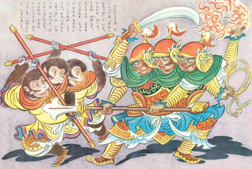 哪吒大战孙悟空。在日本画家的笔下,哪吒成了一个容貌狰狞的大汉,风火轮拿在手里, 混天绫似乎变成了一段麻绳(绘本《孙悟空》,宇野浩二译文、 本田庄太郎绘,日本讲谈社1949 年版)二、哪吒的本土化