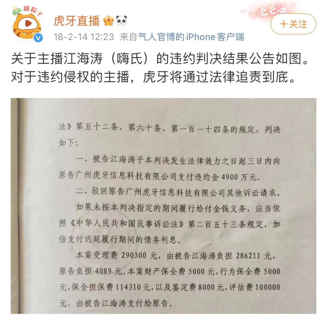 在国内视频行业竞争史上,平台之间互相“挖人”一度十分盛行。例如,在游戏直播领域,2017~2019年,两家头部公司虎牙和斗鱼都试图将对方的大主播招致麾下,由此引发的诉讼至少30多起,违约金规模从数十万至上千万不等。其中,斗鱼挖角虎牙主播江海涛(网名“嗨氏”),最终吃到近5000万元人民币的天价罚单。
