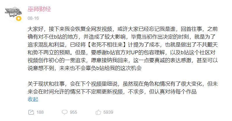 出走两年多后,知名财经视频创作者巫师财经又回到了一切开始的地方。8月16日,巫师财经在B站更新动态,宣布将恢复全网发布内容。次日,它发布了回归之后的首条视频《网红与资本简史》。