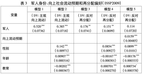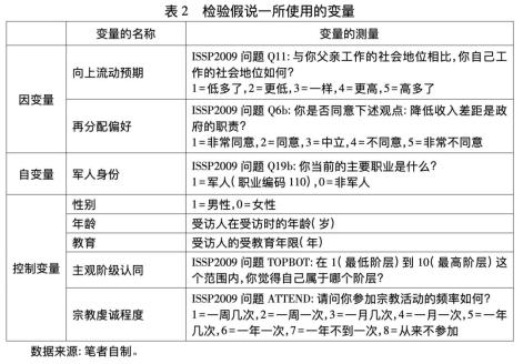 假说一:在个体层次上,与平民相比,军人更可能预期到向上的社会流动,从而更倾向于反对收入再分配。