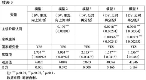 由于假说一的因变量都是定距变量,因此估计方法采用普通最小二乘法(ordinaryleastsquare)。表3报告了回归结果。模型1和模型2的因变量都是向上流动的主观预期,前者除了国家哑变量外,没有加入其他控制变量。后者加入了所有控制变量。可以看到,军人身份的系数显著为正,说明与非军人相比,军人更可能持有社会向上流动的主观预期。模型3和模型4将再分配偏好作为因变量,发现无论是否控制个体层面的控制变量,军人都更倾向于反对收入再分配。模型5的因变量也是再分配偏好,但其在模型4的基础上加入了向上流动的主观预期。比较模型4和模型5可以发现,当加入社会向上流动预期后,军人身份不再具有统计显著性,而向上流动预期的系数显著为正。这说明向上流动预期是军人身份和再分配偏好之间的中介变量,即军人身份通过塑造向上流动的主观预期来引发个体对收入再分配的反对。这符合假说一的预测。