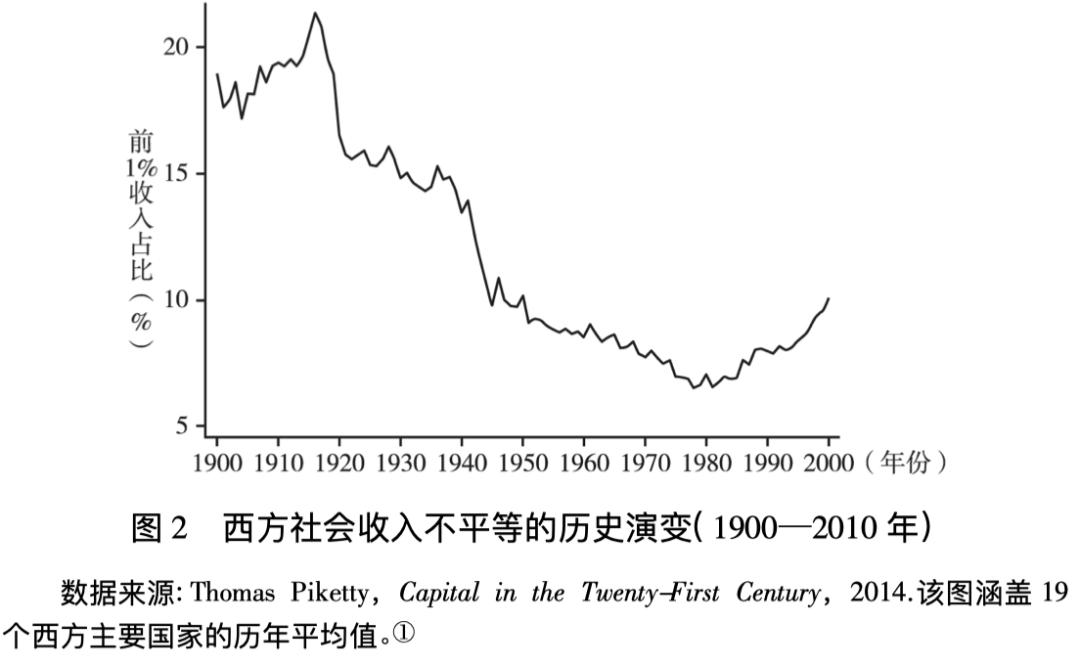 基于此,本文为另外两个重要议题提供了新的洞见,可作为未来的研究方向。第一个议题是人类社会不平等的历史演变。自2008年国际经济危机爆发尤其是托马斯·皮凯蒂(ThomasPiketty)的《21世纪资本论》出版后,收入和财富不平等问题成为社会普遍关心的重要议题。如图2所示,皮凯蒂发现在资本主义诞生后的大部分历史时期,人类社会的不平等程度一直很高,唯一的例外是第一次世界大战后的近50年。在此时期,不平等程度降至最近一个多世纪的最低水平,随后又于20世纪80年代后迅速升高,今天已恢复至战前水平。本文对不平等的这一发展趋势提出了一个新的解释:在多极均势、相对和平的19世纪,西方国家的再分配水平都很低,相当于放任了资本主义制度下不平等的扩大。两次世界大战中的巨大牺牲迫使国家将收入再分配的力度增强至历史最高水平———一战后最高一级收入的边际税率迅速上升至40%,二战后各国更是将这一税率提高到超过60%,从而实现了战后前期的社会平等。这种高强度的再分配虽然在冷战两极均势下总体呈下降趋势,但在朝鲜战争和越南战争等多国参与的局部战争的影响下大致维持了近30年,直到20世纪80年代不再有较大规模的局部战争后,收入再分配政策的强度才开始迅速降低。此后,收入的不平等程度也随即升高至二战前水平,即恢复为资本主义社会不平等不断扩大的常态。可见,未来对不平等的研究需要考虑到国际环境和国内再分配政策之间的互动对不平等的发展趋势的影响。