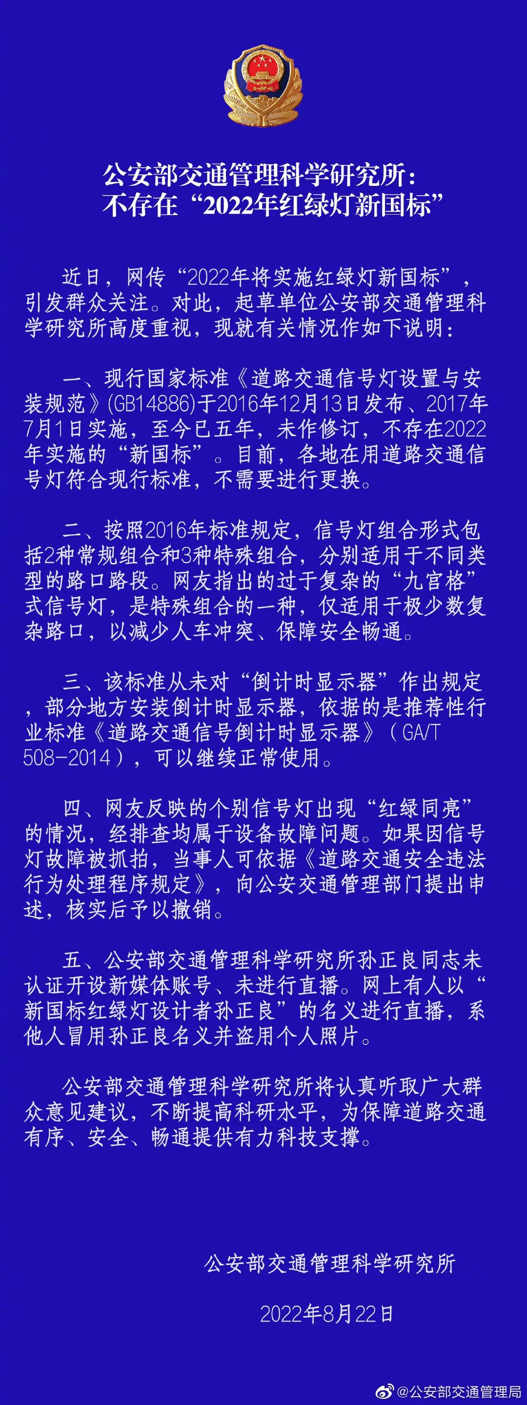 原标题:《公安部:不存在“2022年红绿灯新国标”》