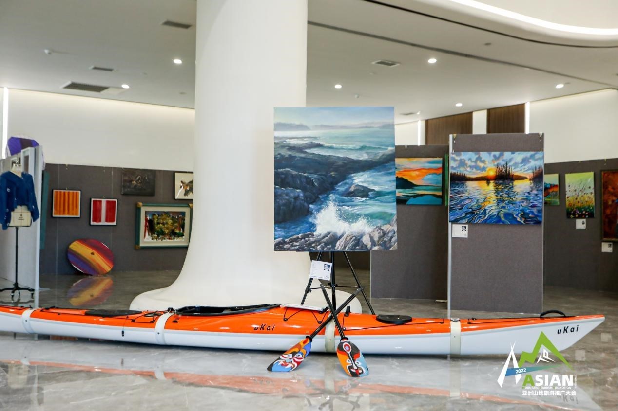 画的正下方展示了一条橙色的小船,场景相互呼应,蓝橙色的搭配也尽情展示着海滨假日的清新活力。胡军特别介绍说,这条小船是由七个可拆卸的部分组合而成,且整个船体重量不超过二十斤,非常轻便,一个人也可以轻松的拖到海边。“因为我们都很喜欢旅游,在登山、划船的时候看阳光洒满每一处景致,这就是造物主赋予大自然最美的颜色。很多时候我们会被感动到,只有被感动,你才能自由且完全的表达出喜爱。所以我们布展的时候就把这些带给我们感触的画作和物品装置在一起,能够更加多维度的展示我们在自然中获得的满足。”配套的船桨也进行了艺术化处理,画上地戏的面具,在国际元素与贵州特色间尝试融合。