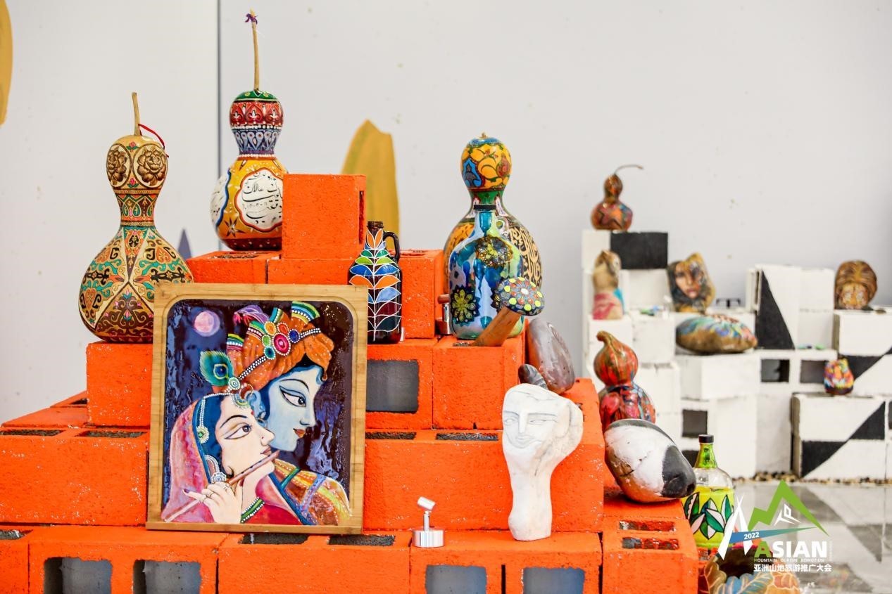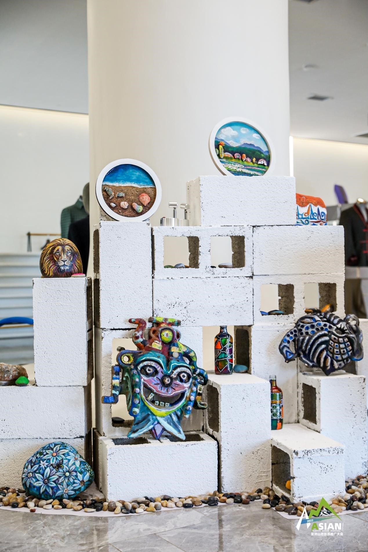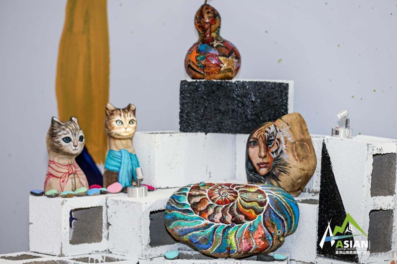 作为本次山地艺术空间展的策展人,贵州索玛文化总经理姜虎生介绍,“山地之美,从一块石头开始发现”板块里所有摆放的作品都由在海外的贵州籍艺术家专门为这次大会赶制的,所用材料全部都是很平常、很普通的用品。“贵州山地多,所以河边、山上随处可见各种石头,这些石头都是很普通很普通的,我们的艺术家就在上面作画,利用石头的形状和纹理来绘制不同的动物;家里平时广泛使用的瓶瓶罐罐,用完之后就在上面作画,色彩和颜色都是很现代的;我们还在菜板上作画,就是家里不用的菜板,拿过来在上面绘制,而且融入了印度的元素,也正好契合了亚洲山地旅游推广大会的主题。就连我们摆放展品的展台都很特别,是我们贵州当地的空心砖,用防水防火的涂料刷成了橙红色,一个非常醒目且很有生命力的颜色。”