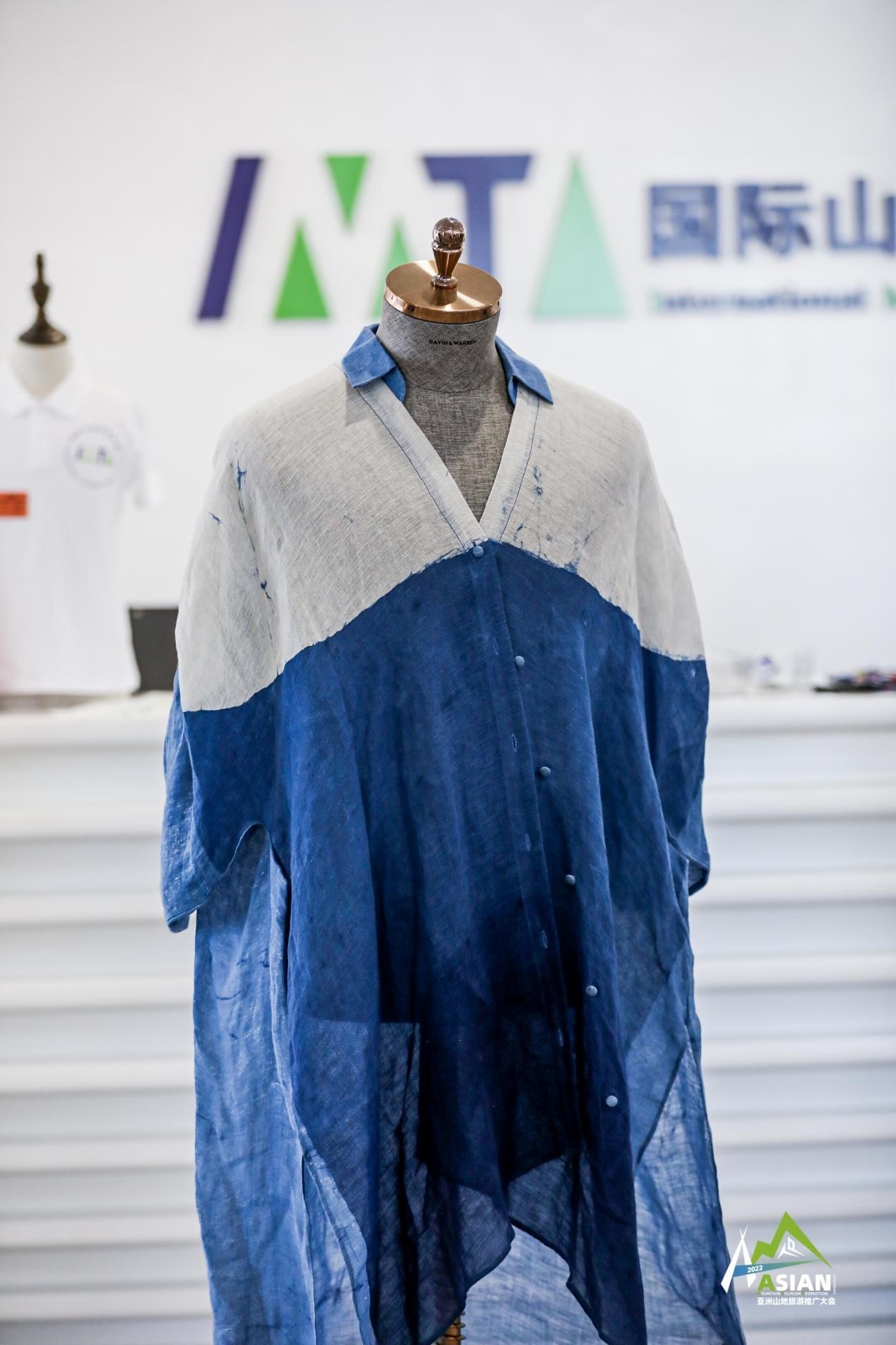除了丝网印刷的民族图案T恤,郭冰还将蜡染工艺与时装相结合,以不规则剪裁、拼接层次、染印层次,抽象化呈现似房顶、吊脚、瓦片等古建筑群元素的造型,建筑线条与服装线条经立体剪裁工艺得到完美结合,多处细节以手工绗缝精细处理。“本次展出的衣物面料都是100%亚麻,以贵州省级非遗传承人伍德芬女士的纯天然古法手工印染工艺为面料染色,每一件的印染效果都是独一无二的呈现。”郭冰介绍,“我们希望在保留传统工艺的同时强调新时尚,设计元素和表达都是最能够紧扣当下的潮流与时代主题。以这次展览我们带来的展品为例,这是非常能够代表我们本民族的一个蜡染的蓝色,非常传统,但也非常漂亮。我们就想要把它做到更加时尚化,在和陈红琪老师的艺术交流中我们也一直努力尝试改变,因为贵州的少数民族服饰虽然漂亮,但比较难穿戴,生活当中装饰性有时大于实用性,所以我们不想做简单粗暴的传承,而是将传统的元素融入其中,能够更加渗入到日常生活。”