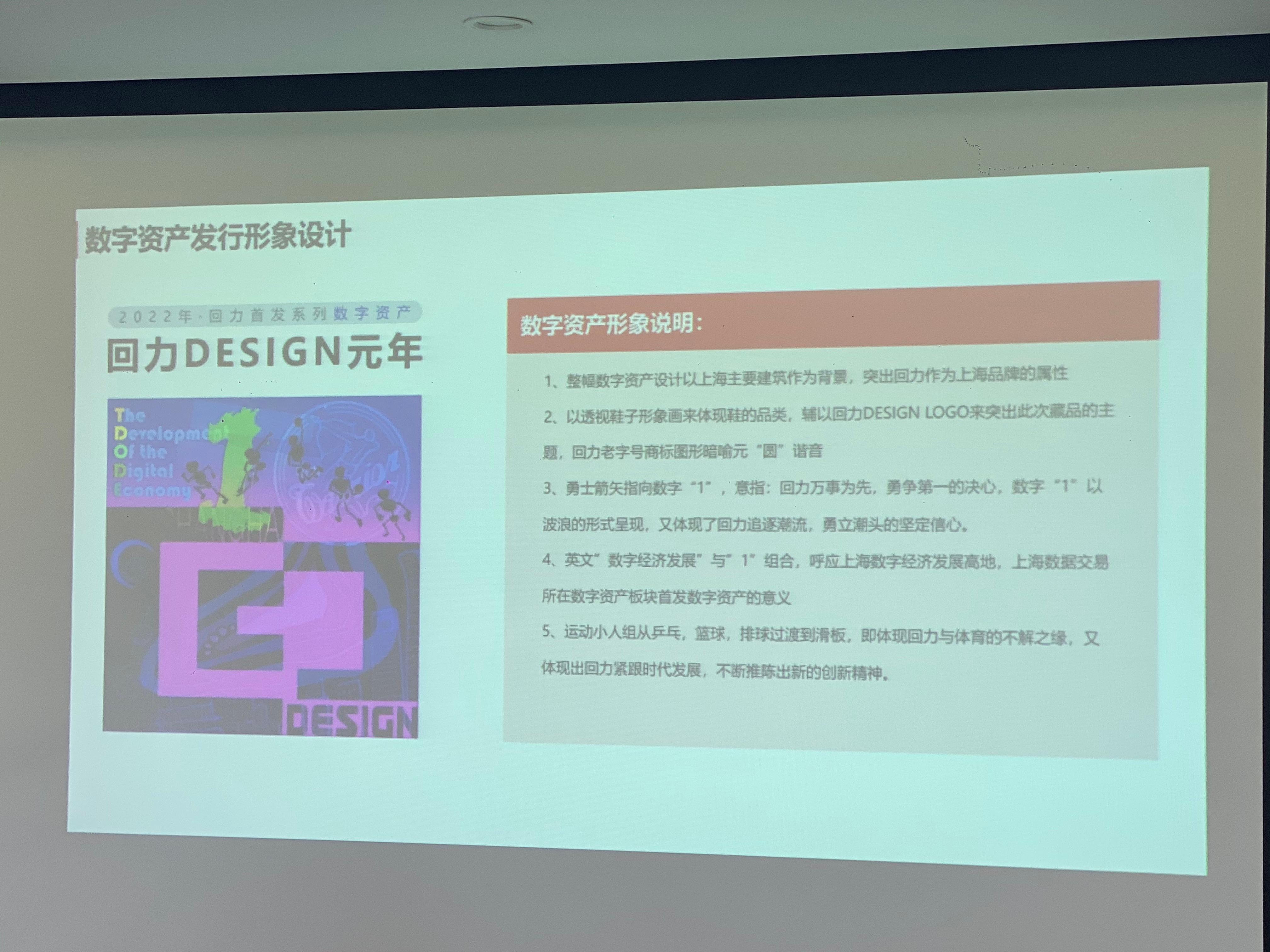 发行方表示,“回力DESIGN-元年”数字资产旨在赋予国有老品牌新的数字化内涵,让回力拥抱Z世代、走向元宇宙。整幅数字资产设计以上海主要建筑作为背景,突出回力作为上海品牌的属性;以透视鞋子形象画来体现鞋的品类,回力老字号商标图形暗喻元“圆”谐音,勇士剑矢指向数字“1”,意指:回力万事为先、勇争第一的决心;英文“数字经济发展”与“1”组合,呼应上海数字经济发展高地、上海数据交易所在数字资产板块首发数字资产的意义;运动小人组从乒乓、篮球、排球过渡到滑板,既体现回力与体育的不解之缘,又体现出回力紧跟时代发展、不断推陈出新的创新精神。