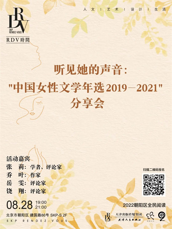 8月28日,在SKP-S,《中国女性文学年选(2019-2021)》年选主编、学者、评论家张莉,将与作家乔叶,评论家岳雯,评论家饶翔一道,分享三年来与“年选”作者的“台前幕后”,检视中国女性文学三年间留下的一块块“路标”。