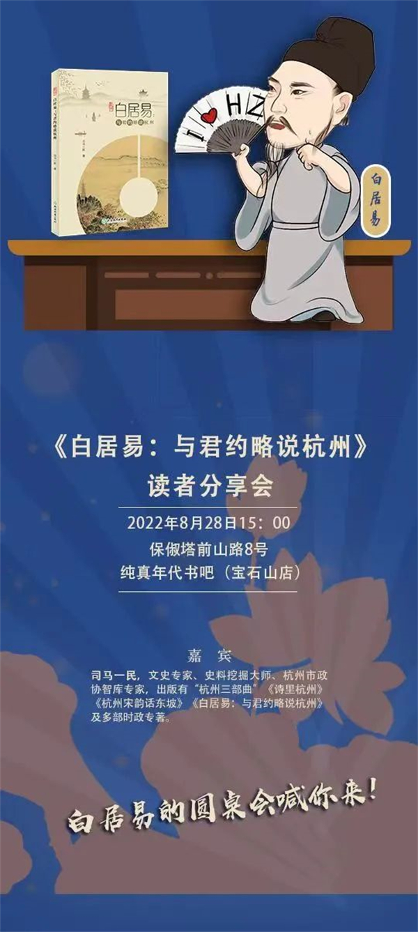 8月28日,司马一民先生将做客纯真年代书吧宝石山店,带着他的《白居易:与君约略说杭州》,还有许多白居易的“大料”——与大家分享挖到的他与元稹日常互怼、从杭州带走石头的各种“料”,和读者召开一场圆桌会议,分享他在杭州的点点滴滴,对杭州的一往情深。