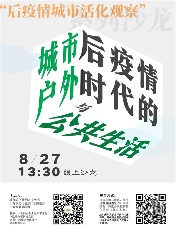 疫情之后,新的需求和生活方式在城市涌现:家门口的风景和体验被更加关注,街道成为娱乐、社交和就餐的临时场所,高频多样的户外活动成为日常生活的一部分。疫情也让我们重新审视,怎样的户外公共空间能够满足公共危机时期市民的生活需求,怎样的公共空间有利于城市的韧性建设?后疫情时代,公共空间的形态与特性是否会影响人们前往户外的抉择,户外公共空间又将如何促进城市的复苏与繁荣?8月27日下午,城市活化研究院(公号)联合上海市文化创意产业促进会、上海大数据联盟,将在线上共同举办“后疫情城市活化观察”系列沙龙第三期《后疫情时代的城市户外与公共生活》,聚焦城市中的户外公共空间,来找寻这些问题的答案。