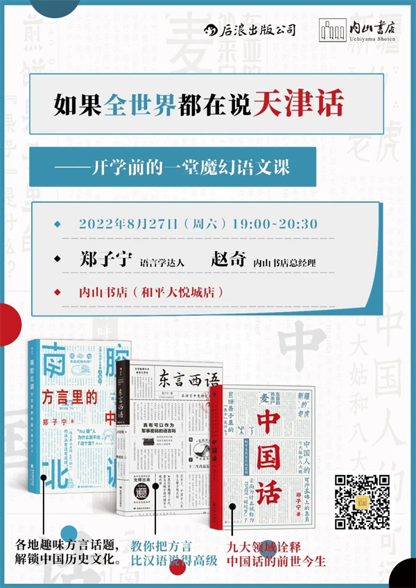如果煎饼夹的是鸡柳而不是果子,天津话会是今天这个味儿吗?在流行钢丝盘头之前,大姨们过年八卦点儿嘛?如果大学寝室里有一个天津人一个东北人,这个宿舍其他人的口音会更像谁?本周六晚,语言学达人郑子宁将携《中国话》《东言西语》《南腔北调:方言里的中国》做客内山书店(和平大悦城店),与你探讨如果全世界都在说天津话这一魔幻主题。