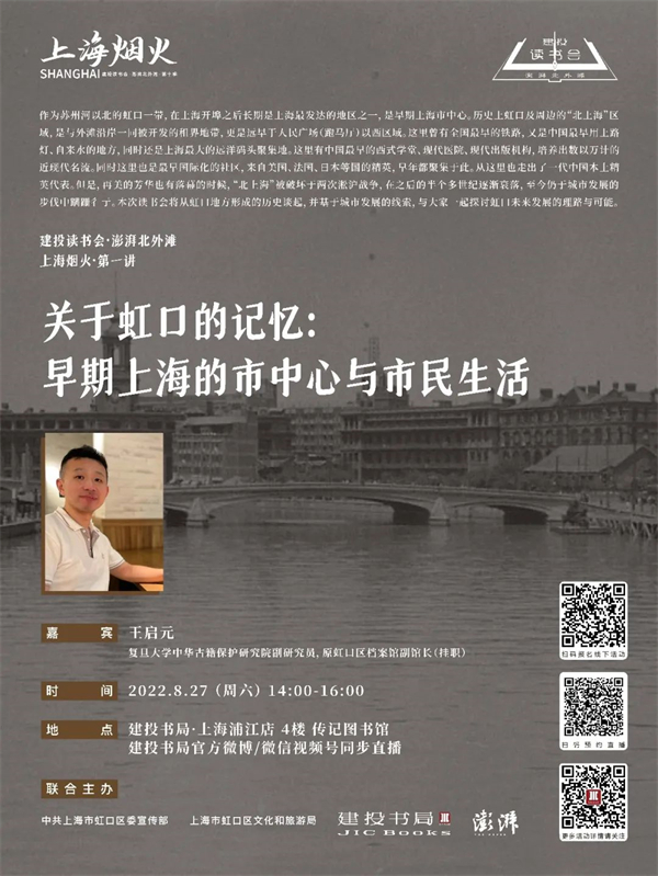 作为苏州河以北的虹口一带,在上海开埠之后长期是上海最发达的地区之一,是早期上海市中心。8月27日,复旦大学中华古籍保护研究院副研究员王启元老师,受邀来到建投书局·上海浦江店,为读者们讲述虹口形成的历史,并基于城市发展的历史与线索,与读者们共同探讨虹口未来发展的理路与可能。