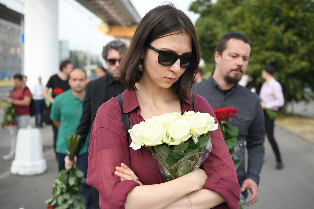 当地时间2022年8月23日,俄罗斯莫斯科,达莉娅·杜金娜的告别仪式在奥斯坦金诺中心举行,民众手持鲜花在入口处排队。