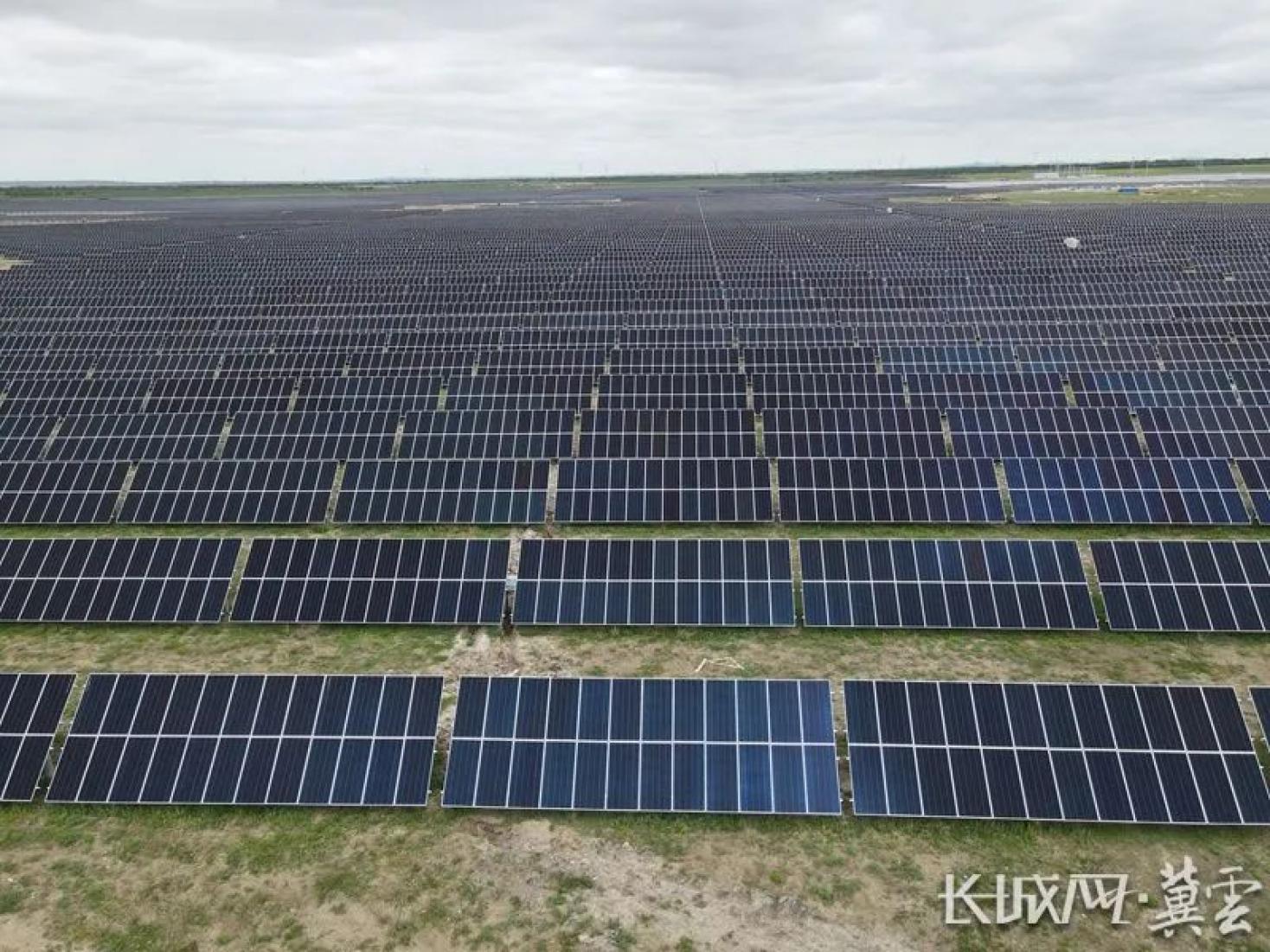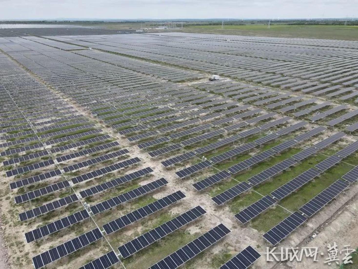 “康保牧场复兴及可再生能源示范基地项目于2020年11月开工建设,占地6000亩,电站总规模200MW,于2021年12月实现并网发电,所发电属新能源绿电助力‘双碳’目标,为当地带来了经济效益和社会效益。” 中民通泰新能源科技有限公司现场经理郭振山对记者说。
