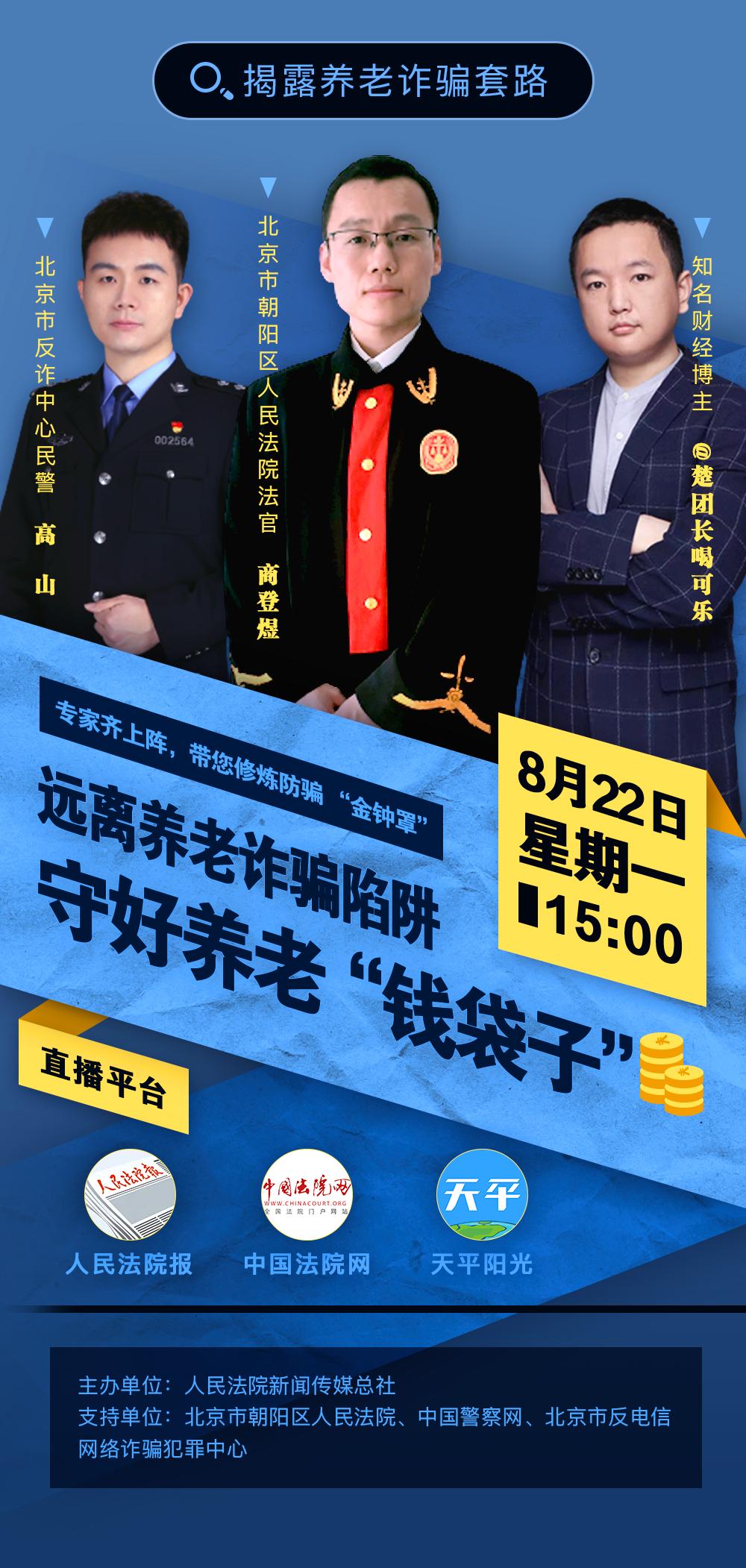 8月22日下午,由人民法院新闻传媒总社举办的“远离养老诈骗陷阱 守好养老‘钱袋子’”直播活动在人民法院报官方微博、视频号、头条号,中国法院网抖音号、快手号,以及天平阳光App等多个平台同步直播。该直播是人民法院新闻传媒总社策划推出的《揭露养老诈骗套路》系列直播活动的第一场。来自北京市朝阳区人民法院的法官商登煜、北京市反诈中心民警高山以及知名财经博主 @楚团长喝可乐 作为嘉宾参与了本场直播,三位嘉宾从各自专业领域出发,就如何守好养老“钱袋子”作了普法和观点分享。
