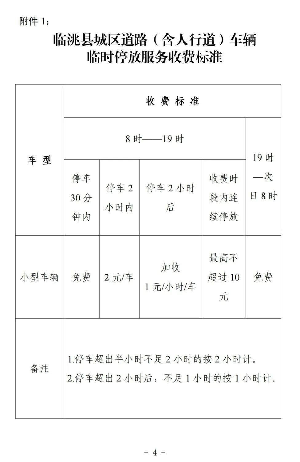 附件1:临洮县城区道路(含人行道)车辆临时停放服务收费标准