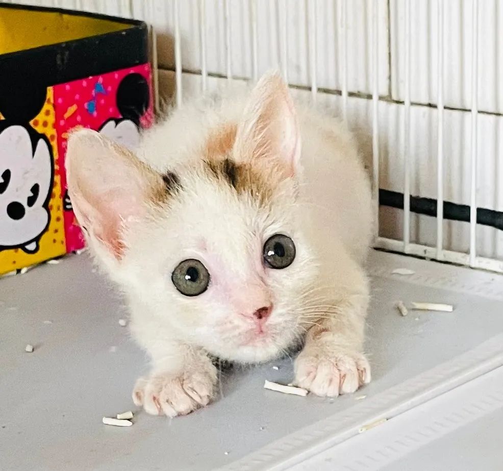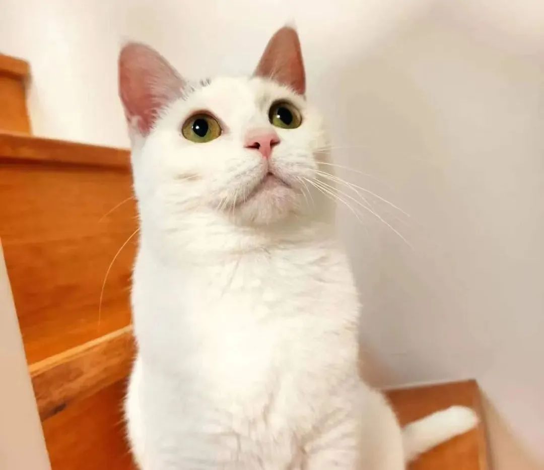 救助人自述:救下这只猫猫的时候是2021年3月底,在南浦大桥高架废弃岗亭发现了一只白色母猫,而且是带着一窝刚出生的小奶猫宝宝。