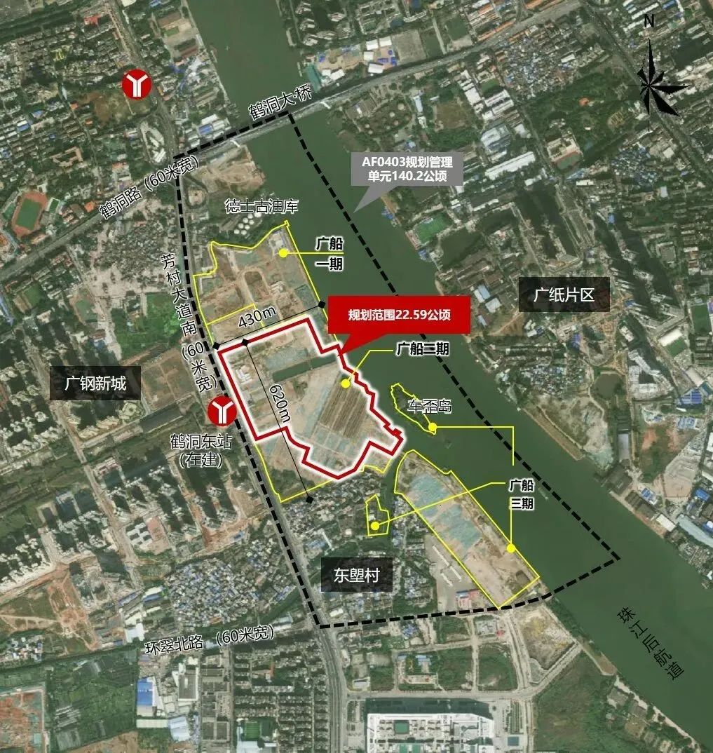 本次进行规划优化的是广船二期地块,规划范围面积为22.59公顷,地块西面临近快速路芳村大道南,北面临主干路鹤洞路,西侧为广州地铁11号线(2023年建成)和佛山地铁11号线(远期规划)鹤洞东站。