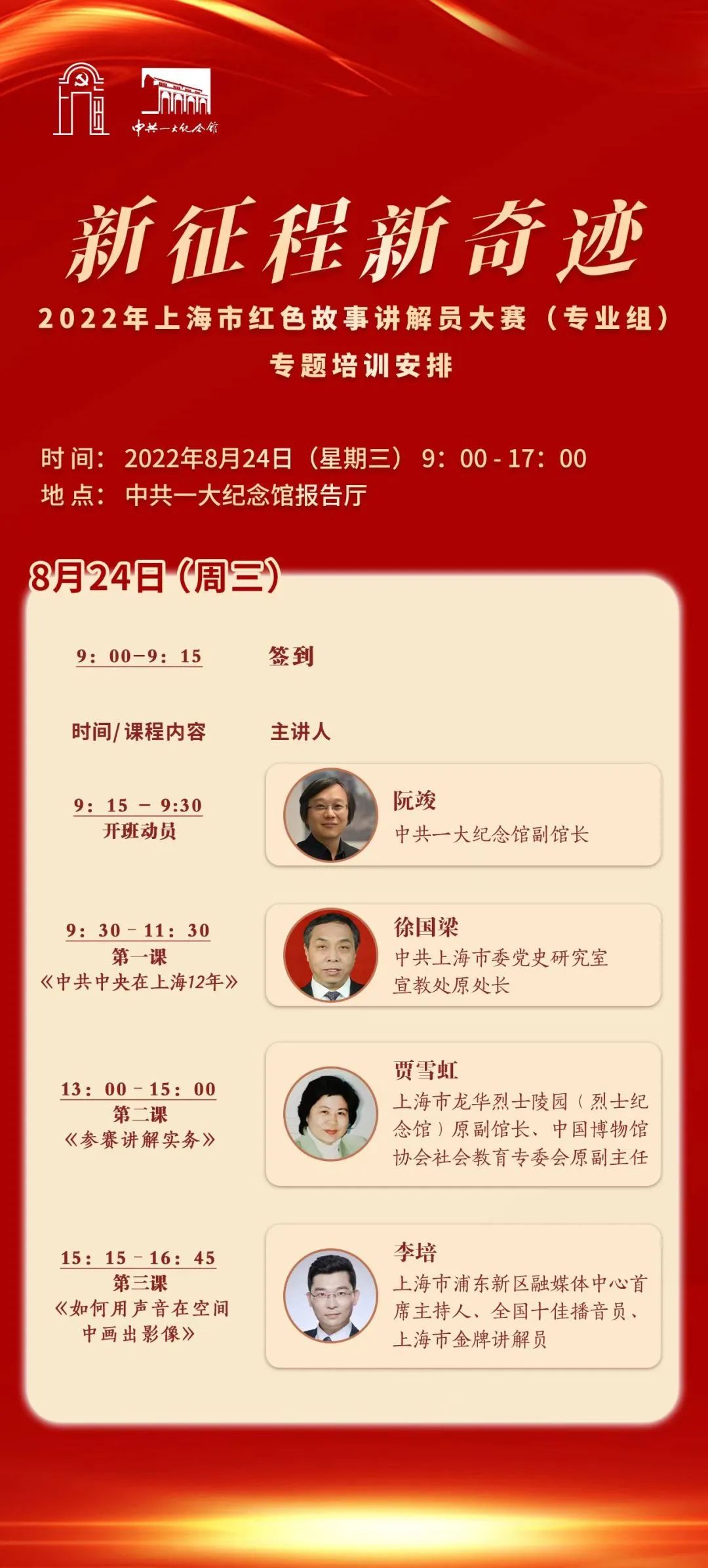 8月24日,新征程·新奇迹——2022年上海市红色故事讲解员大赛(专业组)赛前培训在中共一大纪念馆报告厅举行,入围决赛的30强选手参加了此次培训。