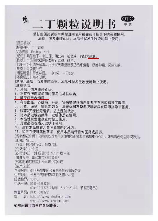 蔗糖是由葡萄糖和果糖组成的双糖,GI为65。药用蔗糖是药用辅料之一,具有矫味、赋形作用,被广泛地用于药品的颗粒剂、片剂、糖浆剂、口服液、膏滋、丸剂等口服制剂中,尤其是中成药制剂。依据《中国药典》二丁颗粒(蔗糖型)的注意事项中示糖尿病患者慎用,按照其用法用量与制法,蔗糖单次服用量为18g,单日服用量为54g。、