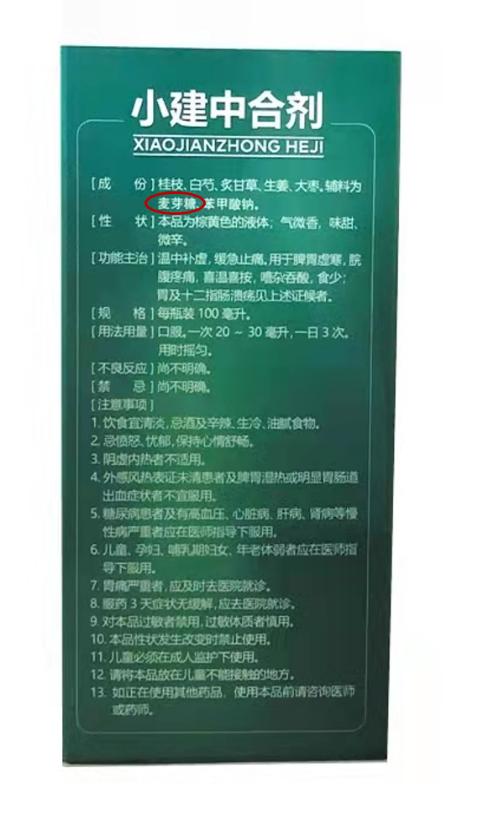 麦芽糖是两个葡萄糖分子组成的双糖,甜度约为蔗糖的三分之一,但GI为105。依据《中国药典》小建中合剂其用法用量与制法,麦芽糖单次服用量为7.4~11.1g,单日服用量为22.2~33.3g。