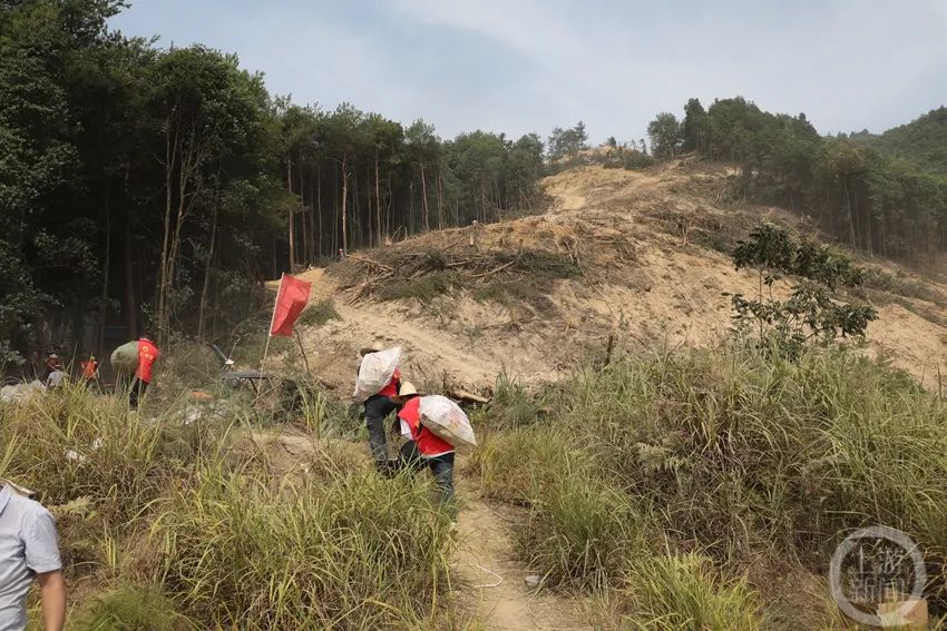 在应急救援人员和当地政府的指挥带领下,志愿者们用不计其数的摩托往返和“人工背夫”,还协助在缙云山西南侧挖掘出了一条延绵数公里、长达几十米宽的隔离带。