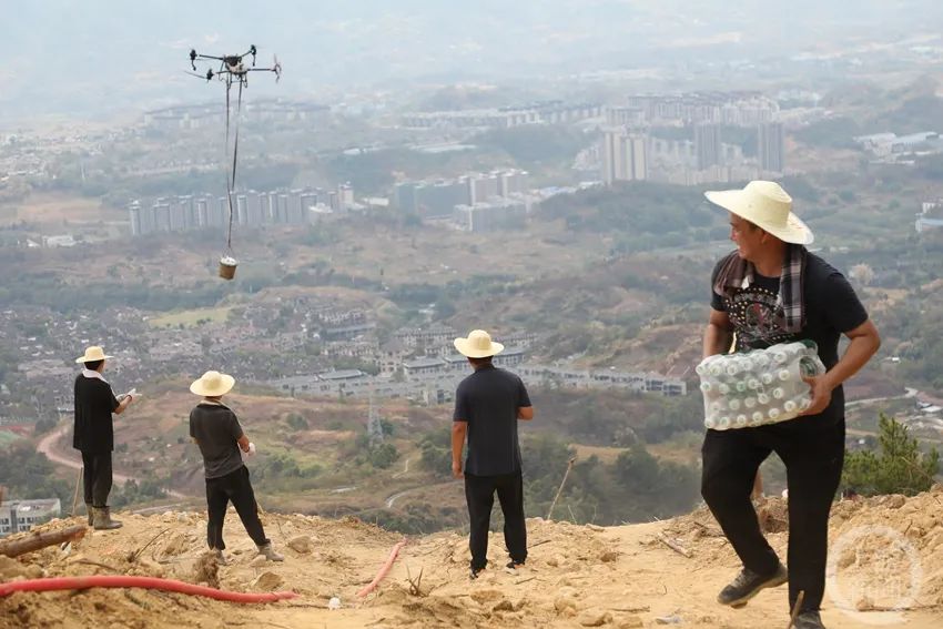 山路再往上走就连摩托车也开不进去了,除了依靠无人机投送物资,又来了“徒步大军”——男女老少齐上阵,用“最原始的办法”背着物资,手脚并用地爬上山,顶着45℃的极端高温,将水、防暑药品、食物带上山。