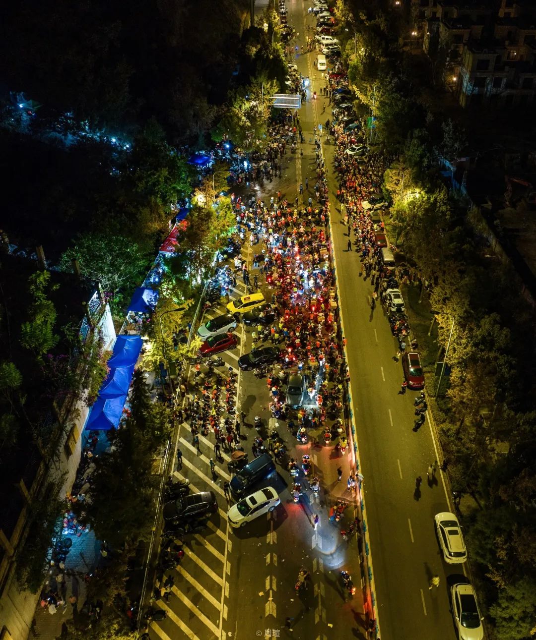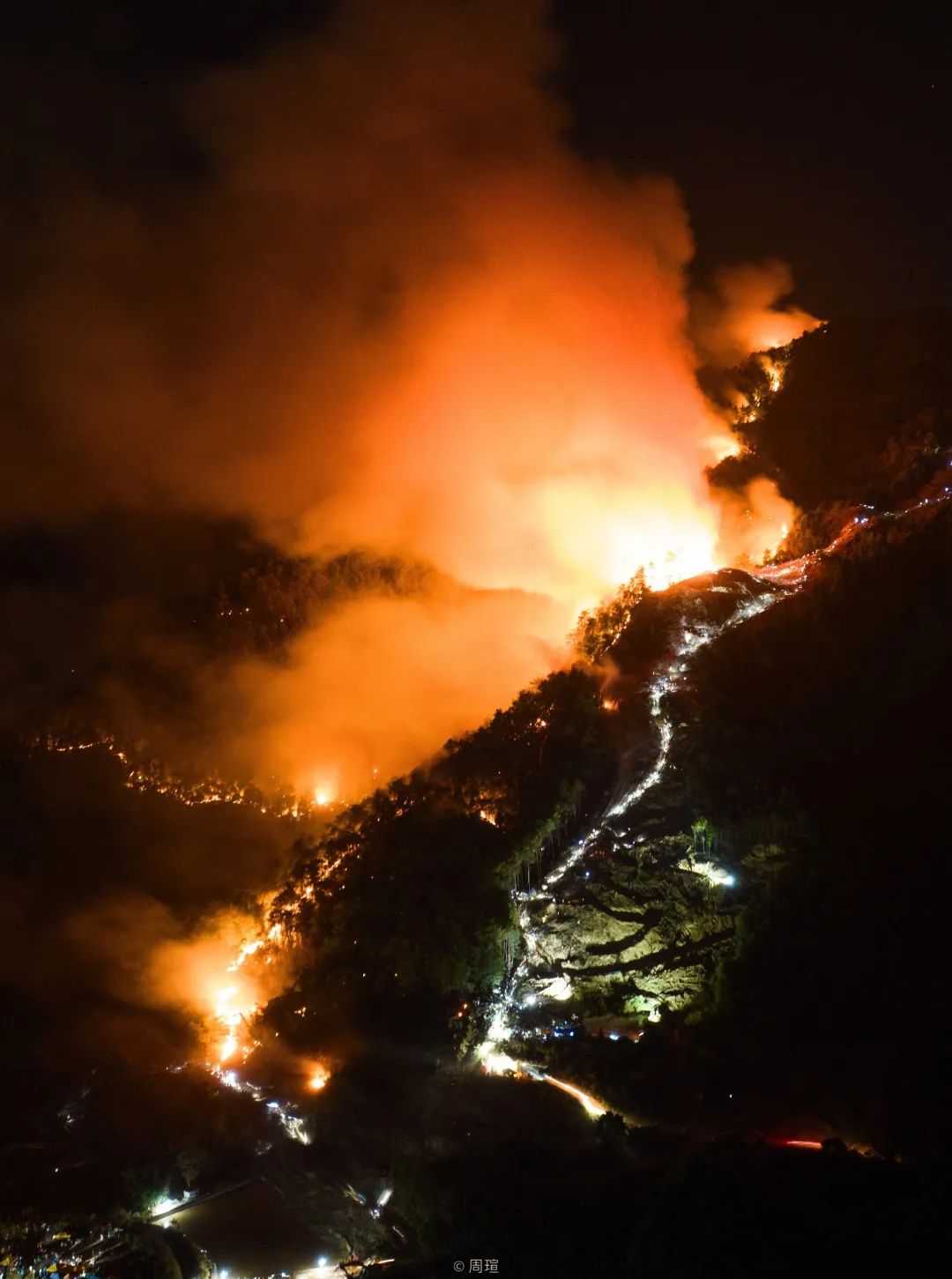 他们头顶上带着的蓝色头灯连成了一条“光链”,与深夜里更显狰狞的“火线”隔空对峙,有网友将之盛赞为“中国人民铸成的防火长城”、“新时代的小推车推赢淮海战役”。