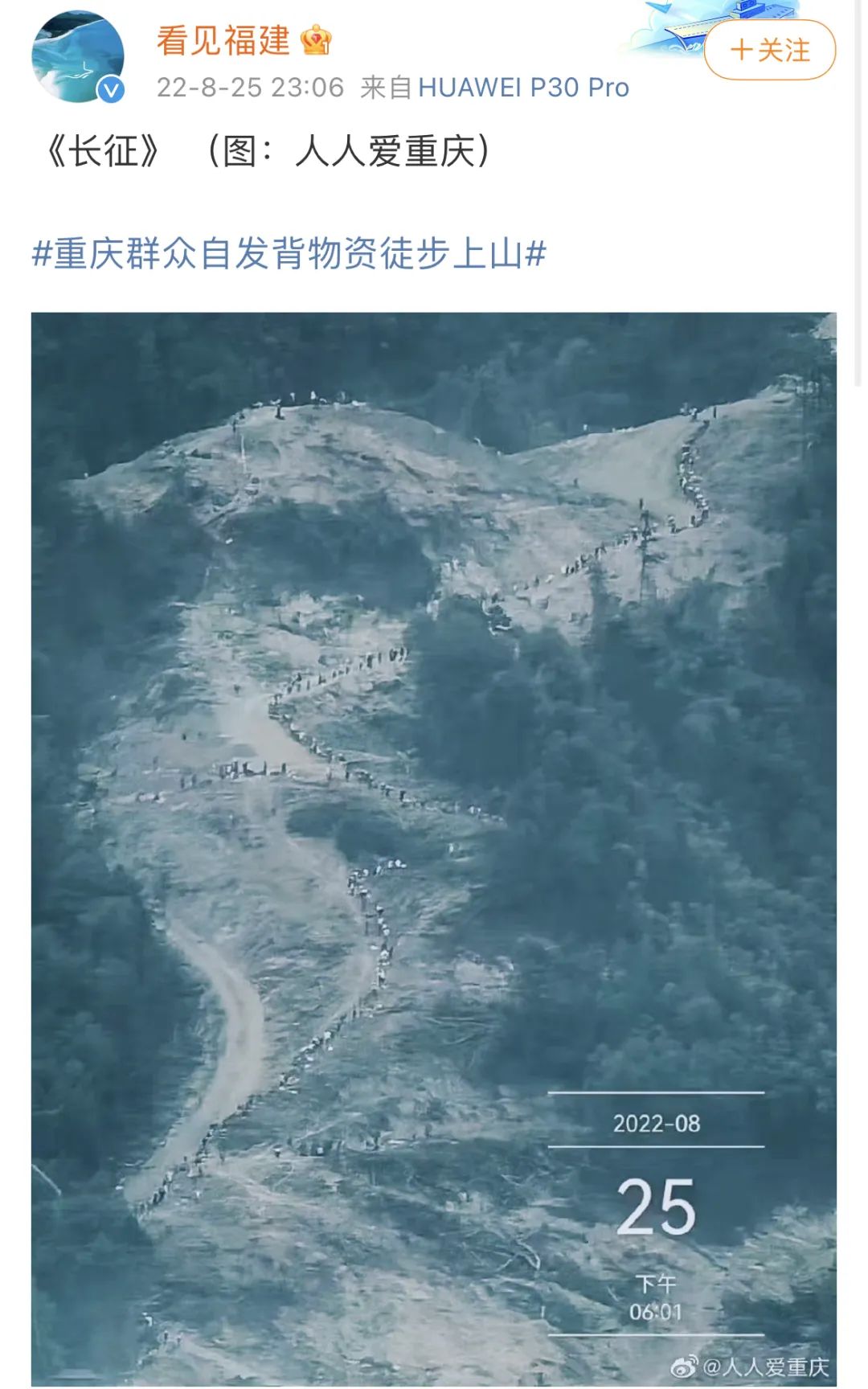 摄影师@摄影周瑄 用航拍镜头记录下山城儿女团结一致,协助前线阻击山火的感人画面:沿着隔离带一路,志愿者们在民警等救援力量的有序带领和指挥下,以接龙的方式往缙云山上运送灭火器、水等物资。