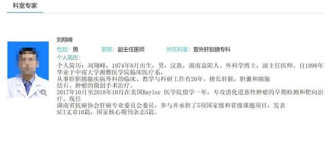 刘翔峰是谁?医院官网资料显示,刘翔峰出生于1974年8月,湖南益阳人,外科学博士,副主任医师。自1998年毕业于中南大学湘雅医学院临床医疗系,从事肝胆胰腺疾病外科的临床、教学与科研工作有20年。擅长肝脏、胆囊、胰腺结石和肿瘤的微创手术治疗。2017年10月至2018年10月在美国Baylor医学院留学一年,专攻消化道恶性肿瘤的早期检测和靶向治疗。现任湖南省抗癌协会肝癌专业委员会委员,参与并承担了5项国家级和省级课题项目,发表SCI文章10篇,国家核心期刊杂志5篇。