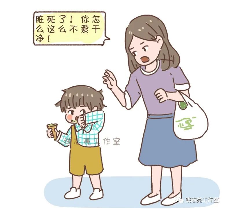 比如孩子吃完冰激凌,用袖子把嘴一擦,家长见状,马上制止孩子: