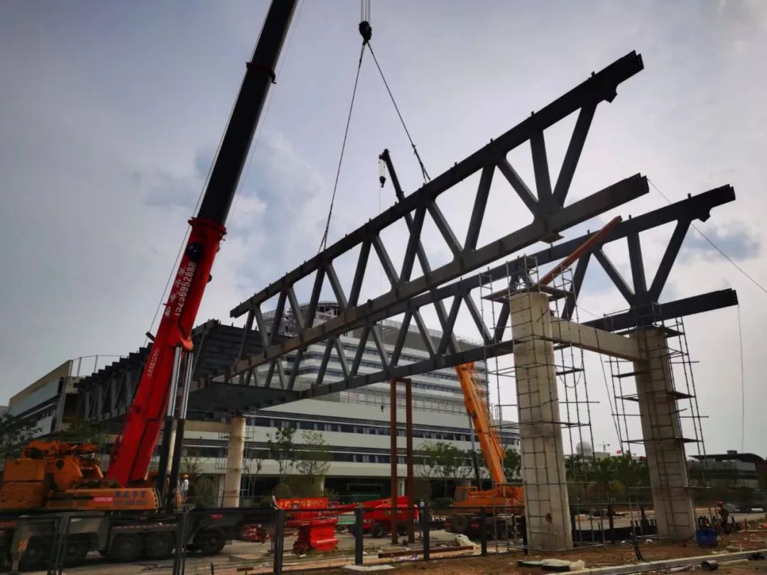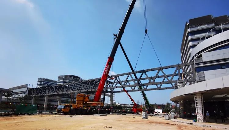 本工程南北区连廊采用钢桁架连廊,桁架总跨度105.551m,桁架高5m,分3段吊装,第1段跨度40.599m,第2段跨度35.293m,第3段29.066m,单榀桁架最重52t,采用600吨汽车吊吊装,吊装工作半径25m。