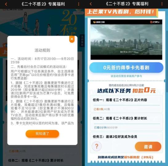 8月17日,《二十不惑2》在湖南卫视、爱奇艺、芒果TV同步播出。开播首日,芒果TV宣布开启“先看后付”这一新型观剧模式,用户完成观看任务后即可免费获得季卡一张。同时,芒果TV在暑期上线“芒果推广大使(M-CLUB)”计划,观众加入后邀请他人成为芒果TV会员,能边煲剧边赚钱,最多一单可得138元。